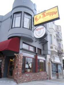 No, not a cigar in sight, nor is this is a store. It’s a charming, North Beach stand by on Columbus, overlooking Washington Square Park. While next door’s Original Joe’s is massive and rowdy, Mario’s is miniscule and organized, with seating mainly at the 10 seat or so bar. It’s a rare local’s joint in this area, despite Frommer’s being in love with it. The espresso sadly is very bland and watery like Caffe Roma, but the atmosphere and tempting looking pizzas from the oven behind the bar, make this more than worthwhile.