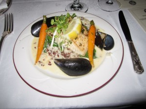 Sarcasm aside, nearly everyone goes towards the meat here, if for any other reason than to have an excuse for Napa Valley cabs…if only the train’s selection was worthwhile. Grilled pork tenderloin is passable atop polenta with three wild mushrooms and a flavorless truffle port reduction. The somewhat tender roasted beef tenderloin was a wiser choice with a Bordelaise potato and carrot sauté. The one show-stopper of the night was the toast with the beef slathered in a luscious Cambazola cheese. What did it have to do with the dish as a whole? Nothing. But good cheese is good cheese.