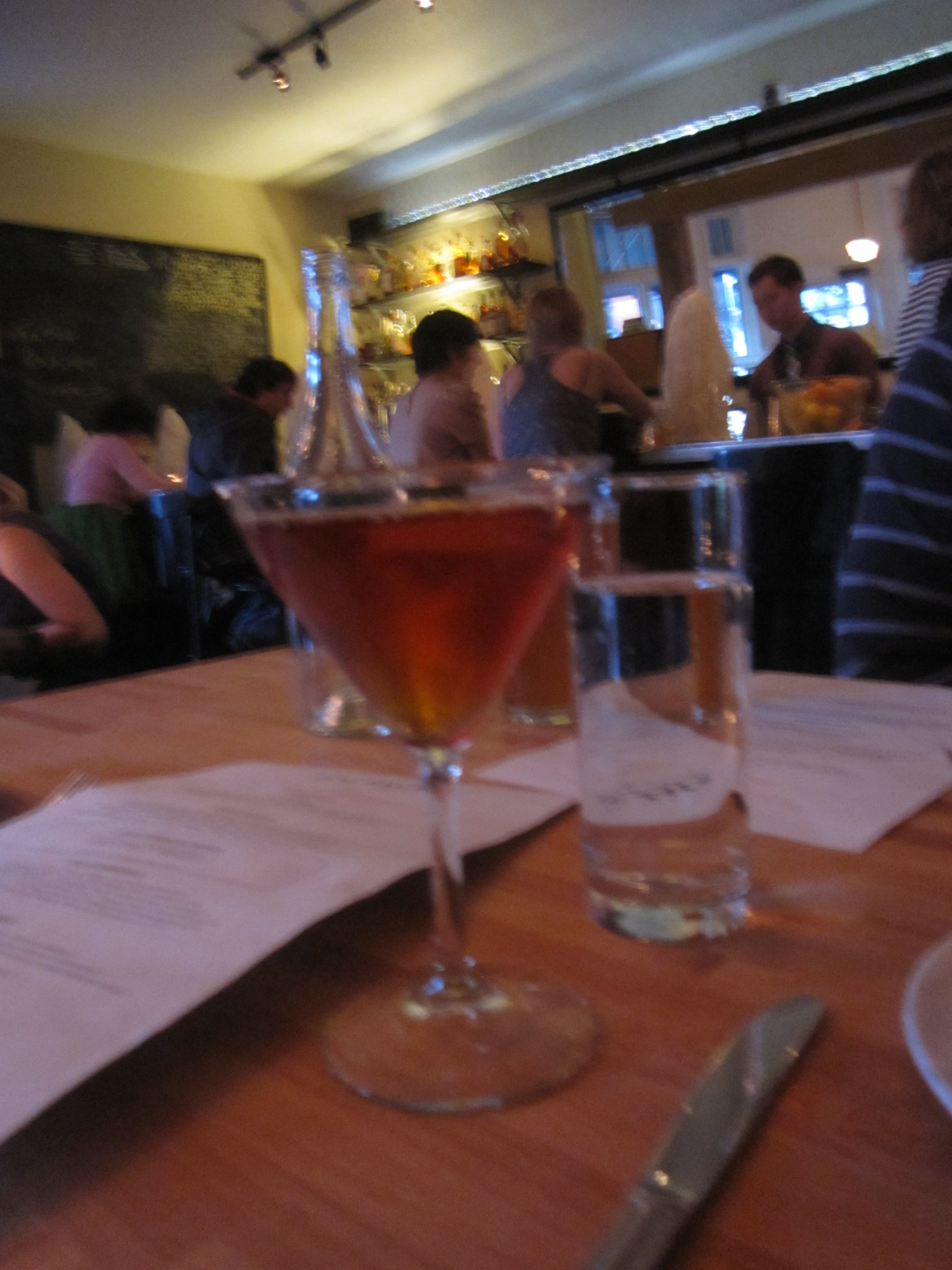 Commence with some of Lyon’s, I mean Portland’s, premier cocktails from that zinc bar. I will always order the Baccarat, as pristine as a Baccarat crystal, a daring take on the Manhattan with orange bitters, sour aperol, and a touch of sweet from maraschino liqueur. For something lighter yet still complex, the French Pearl, designed by Audrey Saunders of New York’s Pegu Club, blends tow classic French apértifs: a mojito riff of mint and gin, then mixed with the anise heavy Ricard pastis. You better like mint and licorice for this one. Fortunately it avoids being medicinal, instead is as fresh as the lavender this time of year in Les Baux de Provence.