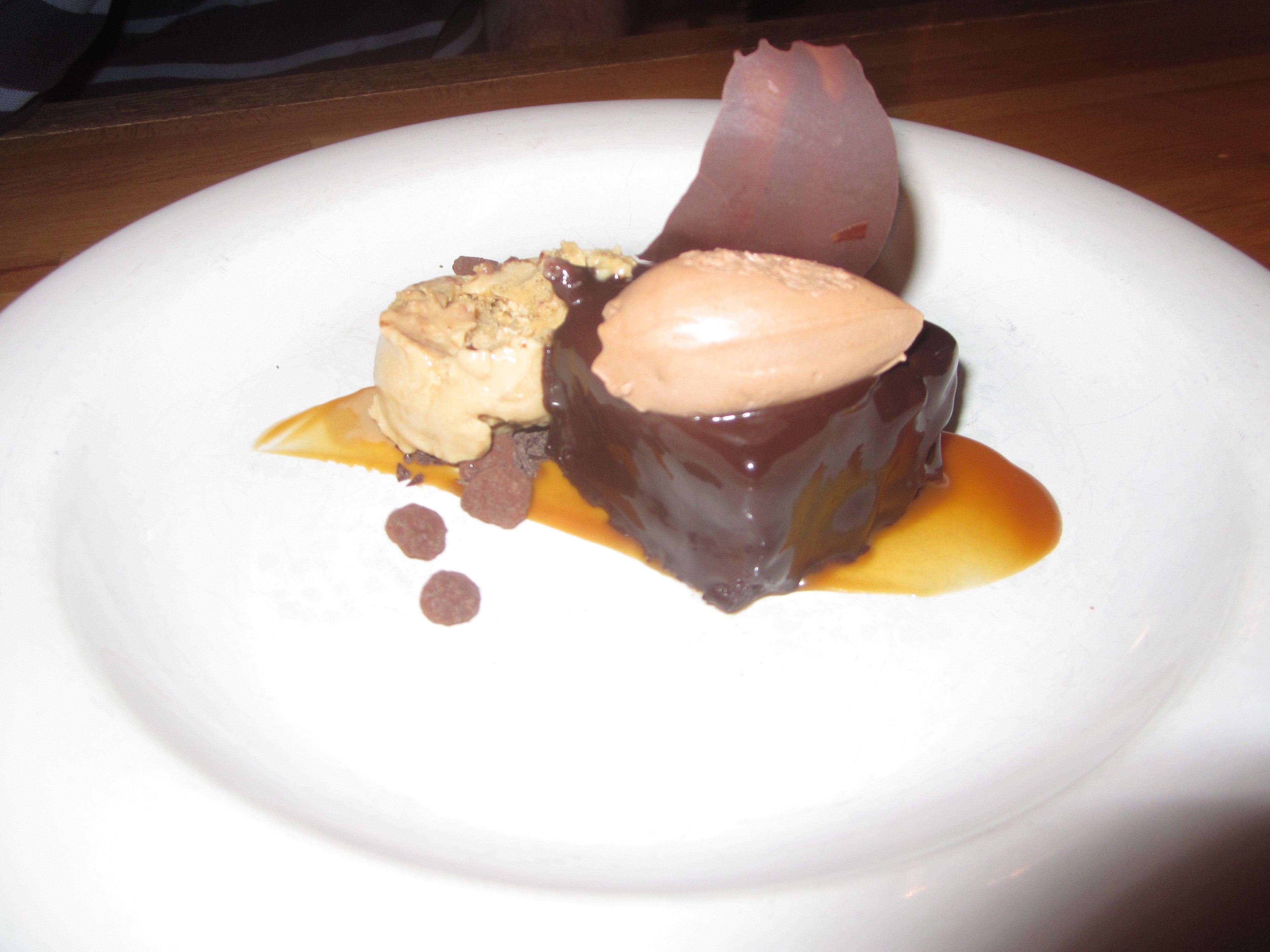 Dark Chocolate & Caramel Crémeux with Iced Coffee Sherbet and Chocolate Covered Espresso Beans