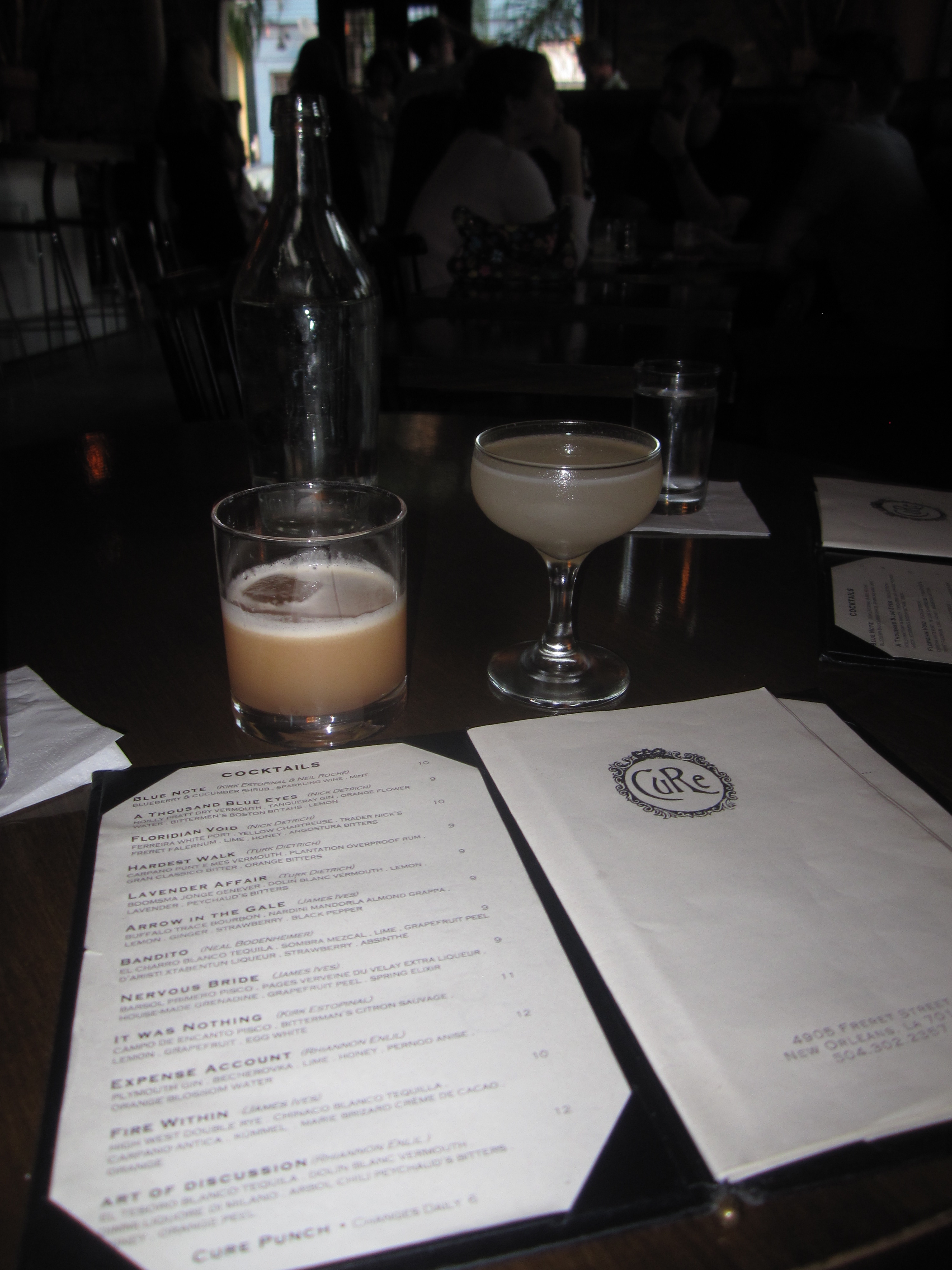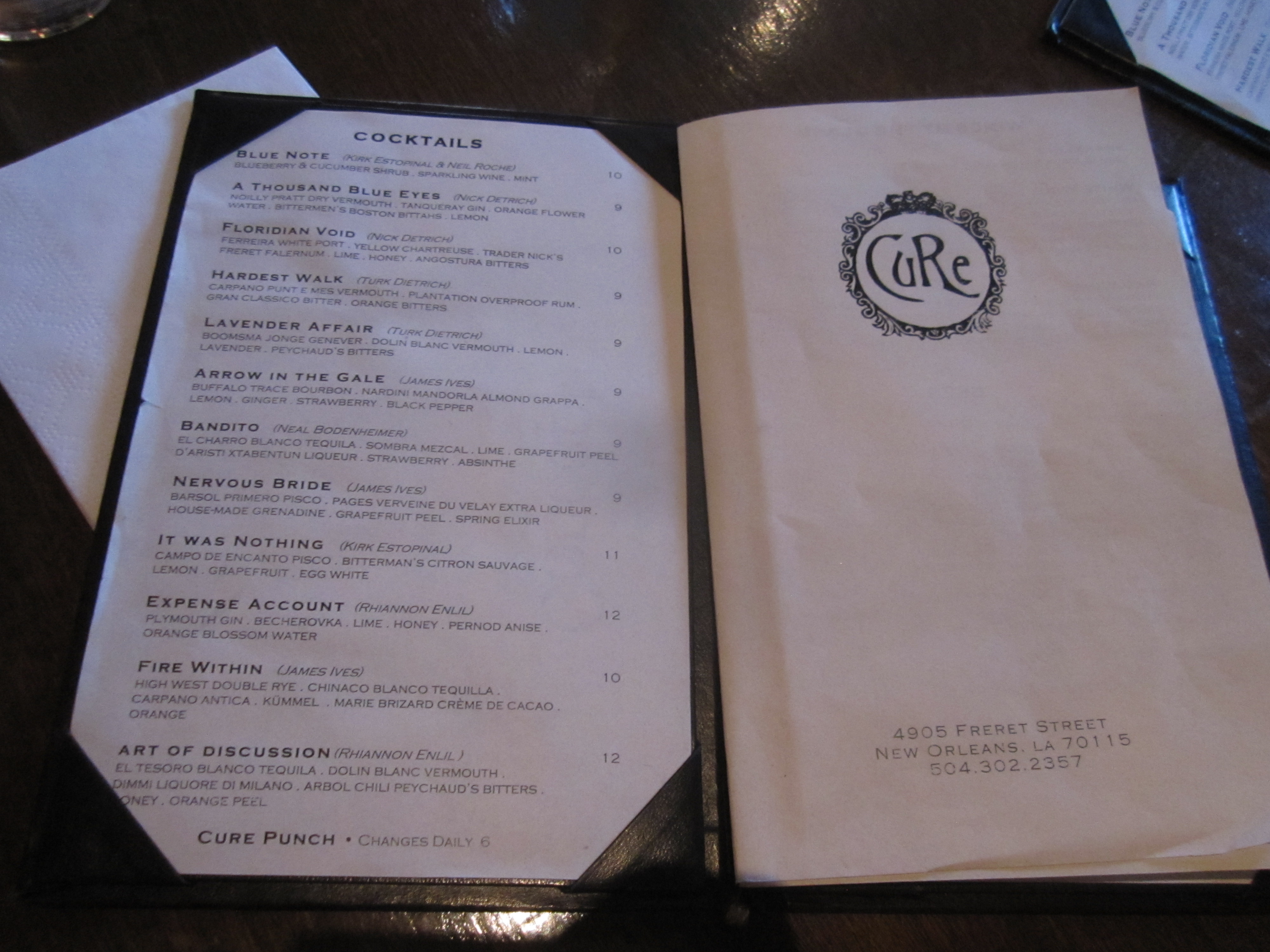 We needed a remedy fast. The first hint that Cure would be the cocktail cure: get away from the French Quarter. Next, this is the domain of bartenders who cater to drinkers who truly want crafted cocktails, not just some rendition of a sazerac or a Ramos gin fizz, or the bane of cocktailian culture, the hurricane.