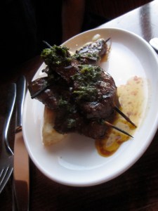 The highlight of the evening actually are the aji sauces that come with the chicken, in particular the emerald green aji amarillo and the excellent chimichurri. Each chicken order comes with two sides: perhaps perfectly crisp yuca fries or the filling, unique rice-beans mash up known as tacu-tacu. Every table gets an order of empanadas and ceviche in some form. This version tasted more sterile than at the original Limon, too bitter a marinade and too pale a fish. Instead, a must order are the antichucos de Res, or beef heart skewers that provide enough funk to be unique, enough grit to be an abnormal meat, but enough elegant tenderness to be an altogether exceptional grilled meat dish.