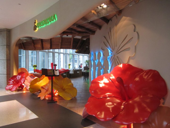 The next floor up is anchored by Lamborghini and the Lamborghini of coffee shops, Starbucks. Somehow Starbucks has mentioned to acquire that luxury branding…not sure about that after a sip of the espresso. The first to fourth floors are mainly glitzy, Right Bank label shops. On floors one and two, A Cubed is a chic, modern cocktail bar-restaurant with a surprisingly impressive wine list. Unfortunately the mai tai I drank at happy hour resembled the common fake pineapple mix Trader’s Vic’s convinces the public of as being real mai tais. Still, it was quite the surreal setting for the mai tai. If only the the deep, horseshoe personal booths that serve as chairs weren’t meant for Shaquille O’Neal to sit in them. The other unfortunate part was learning that Taipei must not really do happy hour. You don’t want to be the only ones getting happy at 7 pm.Then again on the fourth floor, nobody was enjoying happy hour either at Haleakala, a Hawaiian plantation themed spot that seems like an exact replica of the Duke’s Canoe Club- Kimo’s restaurant group. I decided not to try the mai tai here, but it probably would have been so much more authentic, right?