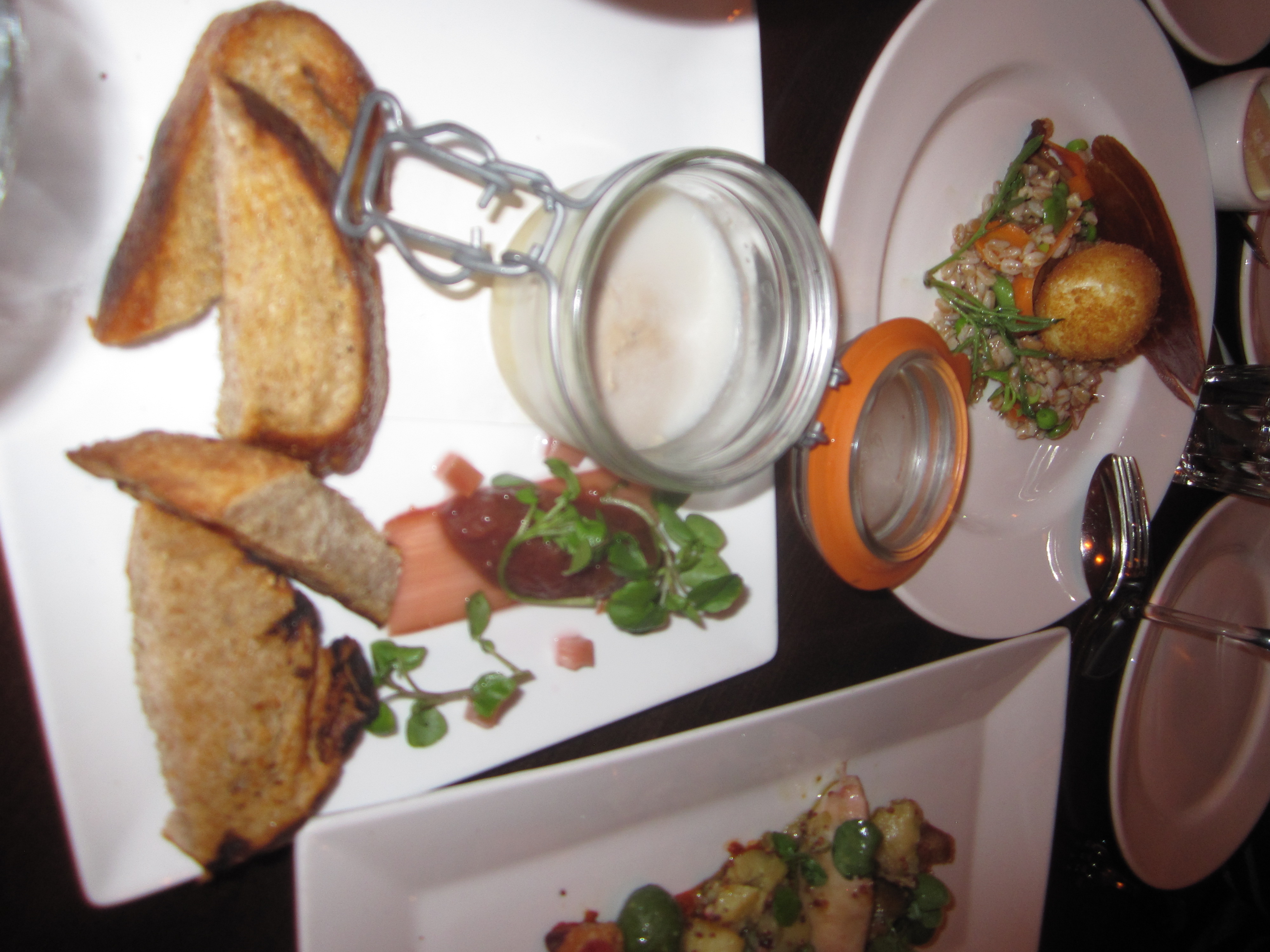 Far more enticing to the eye and taste was the refreshing spring vegetable and farro salad, with a deep fried farm egg, pickled ramps, and artfully presented like a wafer La Quercia proscuitto. The hands down premier dish of the night was, yes, foie gras and chicken pâté in a canning jar, as smooth and robust as a 1985 Bordeaux. With a glass of sauterne, a dab of the vanilla rhubarb compote on top of the pâté slathered over Baker’s charred country bread, there is no better way to bid farewell in California to foie gras than this.