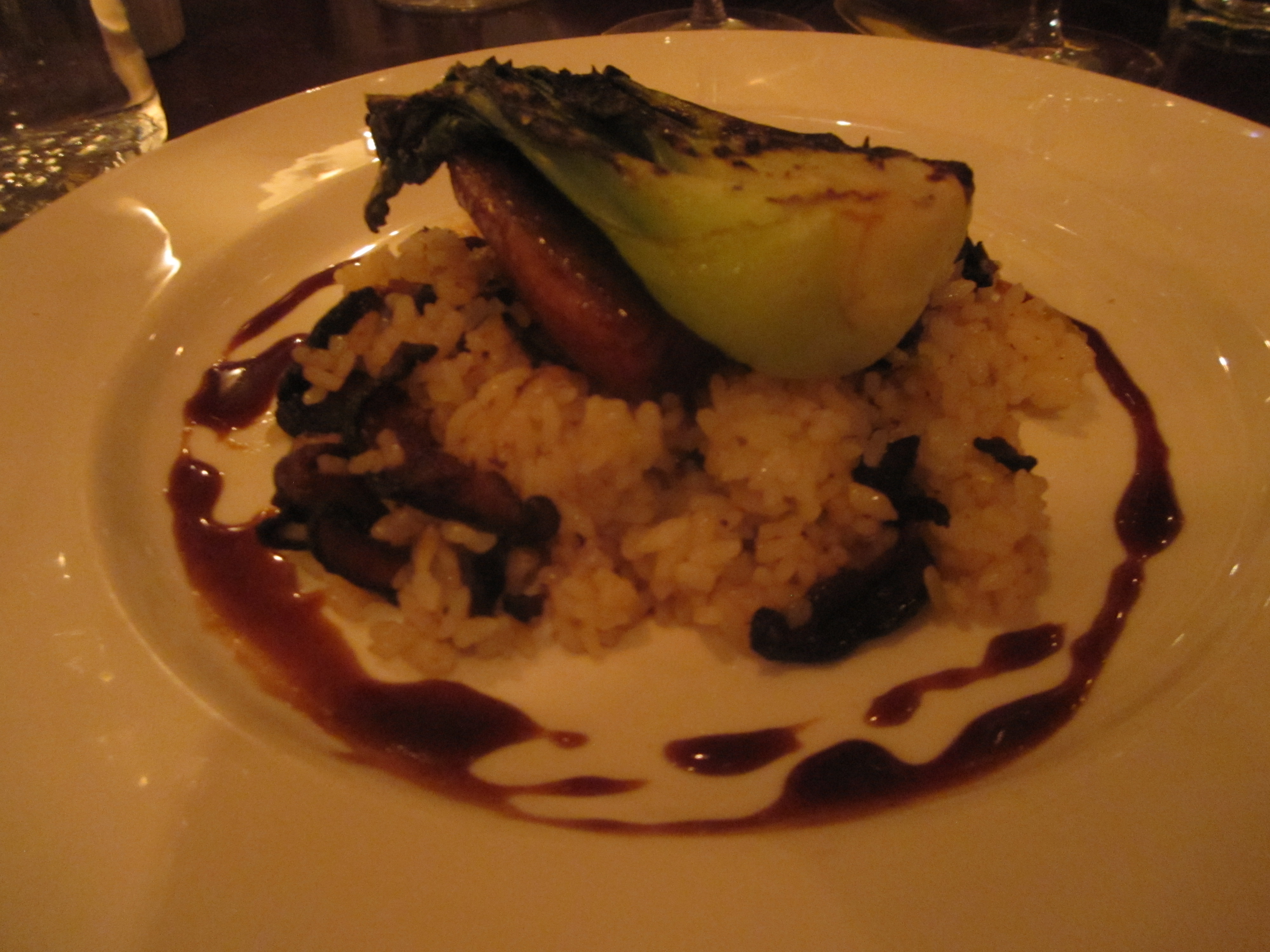 The compact restaurant leads to a compact menu of six starters, six main plates, and five desserts. There is always one vegetarian main dish, always tempting. Currently it is goat cheese and potato ravioli with zucchini, porcini mushrooms, tempura squash blossoms, and toasted pine nuts. The main plate standard is the excellent mirin and soy braised black cod. Served skin on, the marinade doesn’t quite achieve the same umami impact of similar miso marinade preparations done by the likes of Nobu Matsuhisa, Ray’s Boathouse in Seattle, and Sushi Ran in Sausalito. The texture of the fish, though, is every bit as gentle as any others. Banker has this down to a science. The foie gras shitake sticky rice is a worthy accompaniment, which won’t be around come July. The charred bok choy completes the dish, with the only necessary tweak being that the rice could use more foie gras. There were four tiny cubes amidst the rice, found after a frantic search to find any foie gras. It’s not July 1st in California just yet.