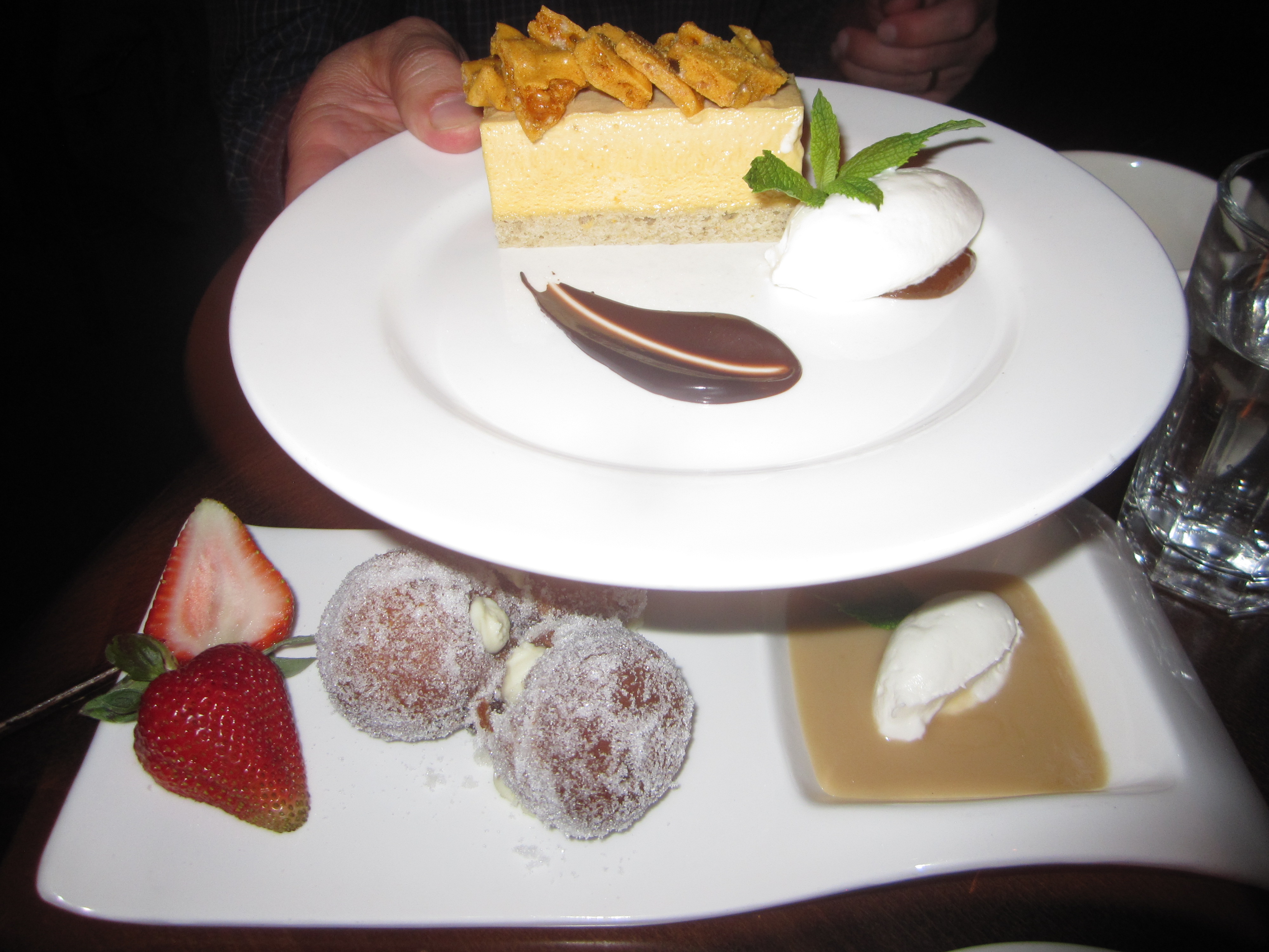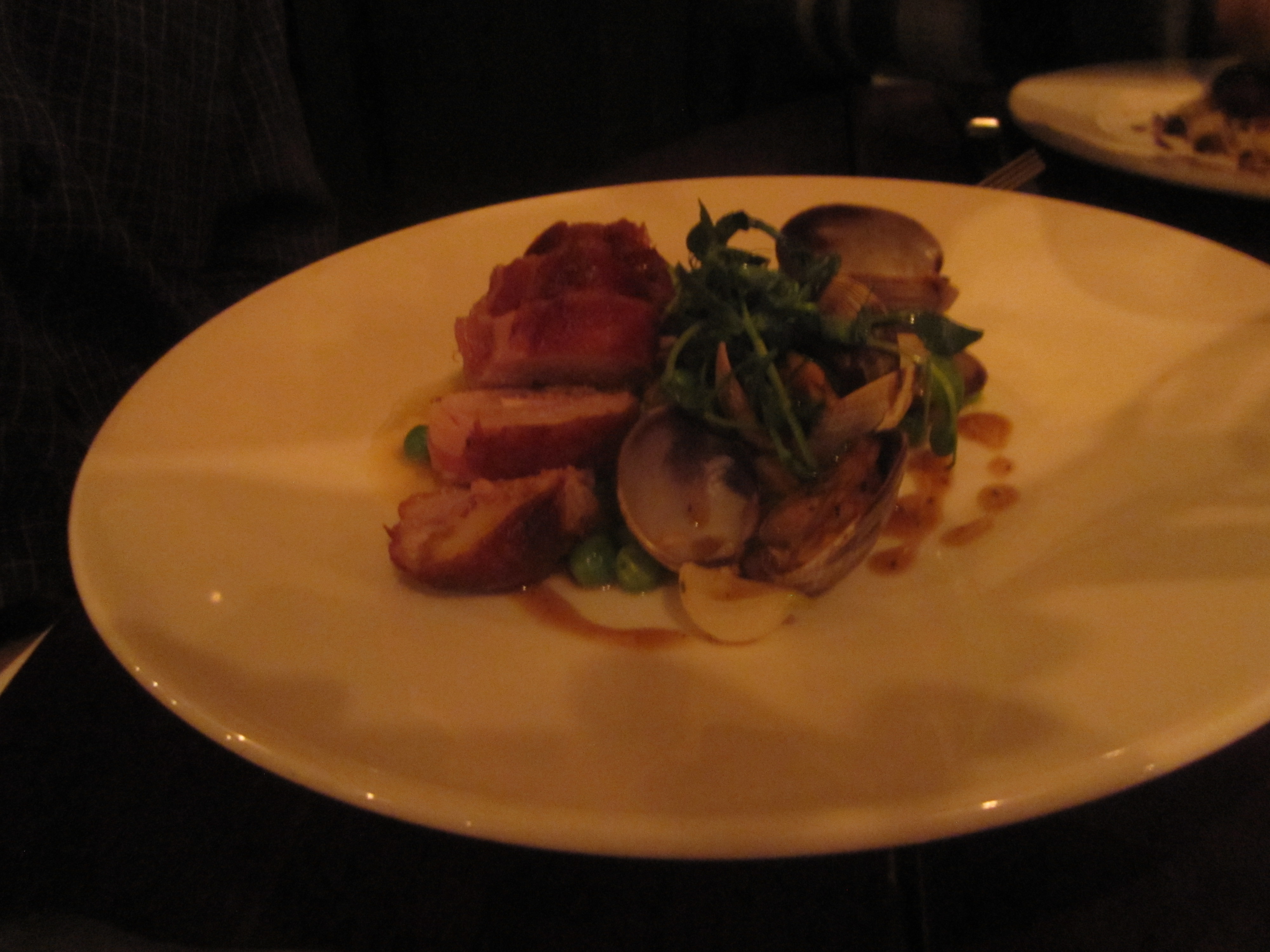 Strangely, Banker’s more daring and winning combinations happen to be with the larger plates instead of the more restrained starters. Surf and turf pops up again with quail roulades wrapped in speck. It’s a completely atypical presentation of quail with no legs, rather medallions of the bird surrounding a brioche stuffing. It’s even more atypical from the addition of Manila clams whose briny flavor completely works when matched with speck and bird. English peas and spring onions add a freshness of the season to round everything out. Equally special is a duck duo of breast and confit with a cara cara orange salad. The cocoa nib reduction could have used an extra jolt and the pan fried polenta alongside was far from exciting.