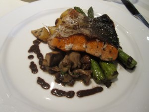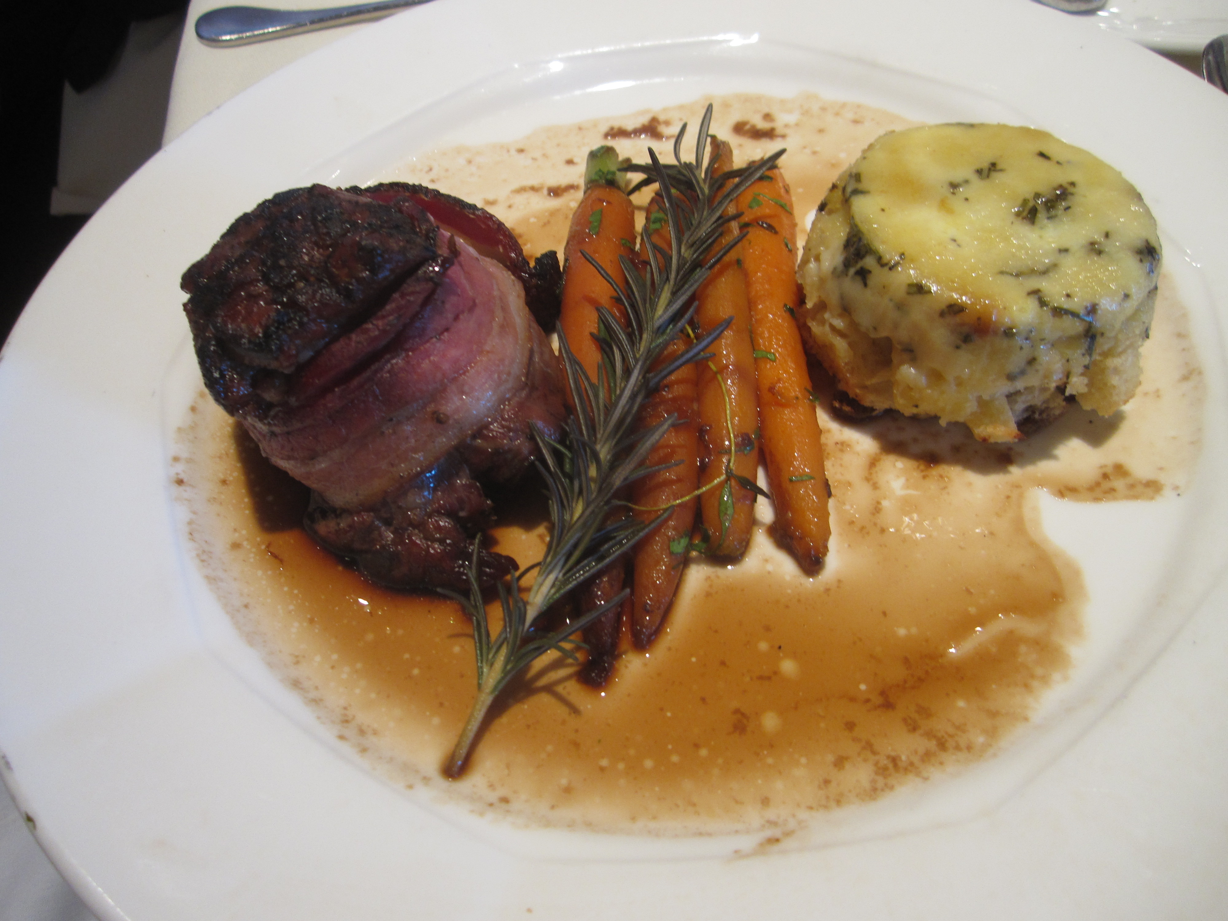 Entrées were a grilled wild king salmon, perfectly moist, with bland fingerling potatoes, overcooked asparagus, and excellent wild mushrooms, in a vague truffle vinaigrette. Of all the dishes, this one veered furthest to the conservative side. Bolton holds nothing back for meat eaters with the bacon wrapped, tender filet mignon, a tad over the requested medium rare. I did not care fir the bread pudding that begged for more of the promised gorgonzola, or the chewy carrots. The shallot jus would have been just fine in any Parisian bistro.