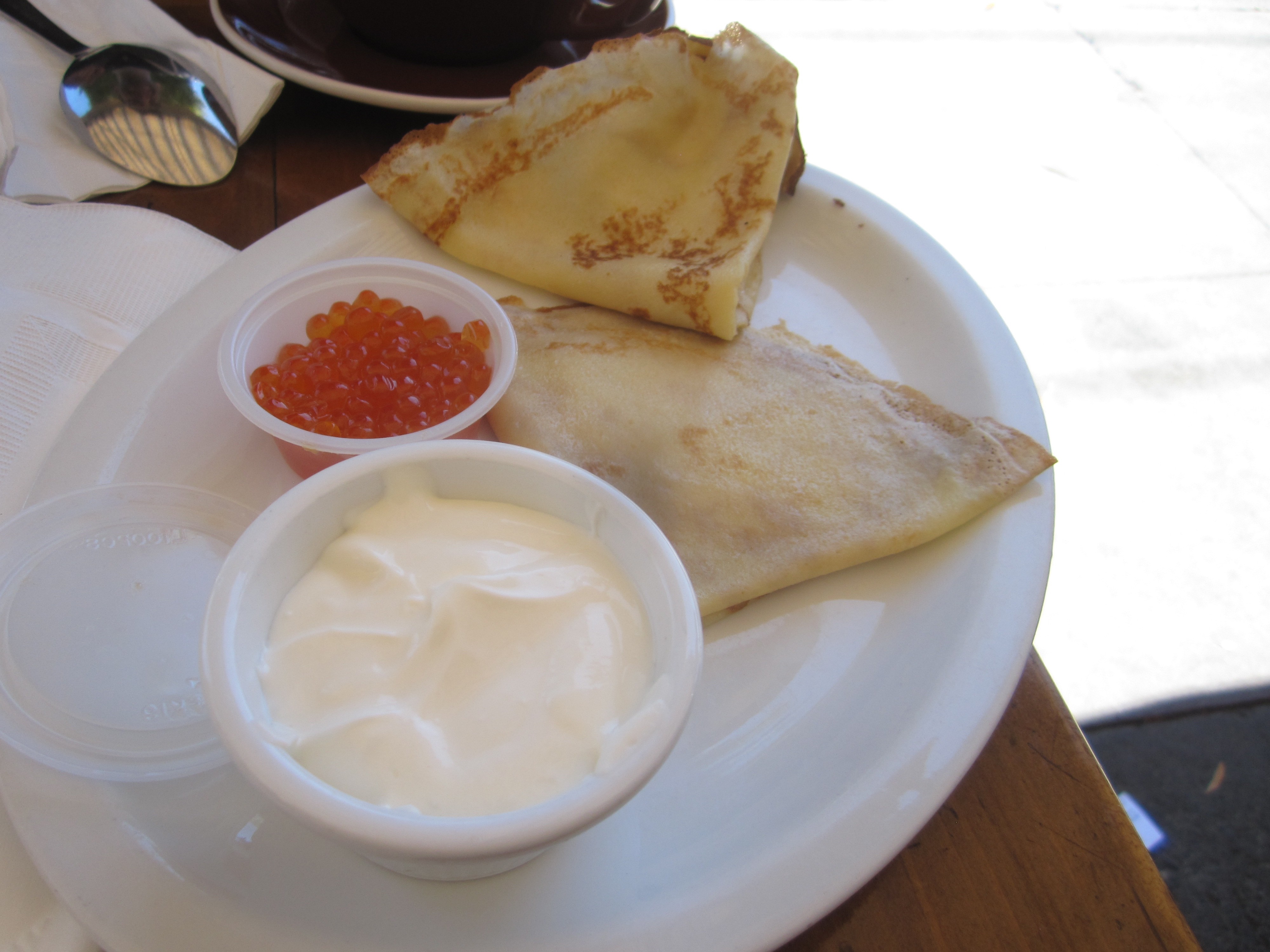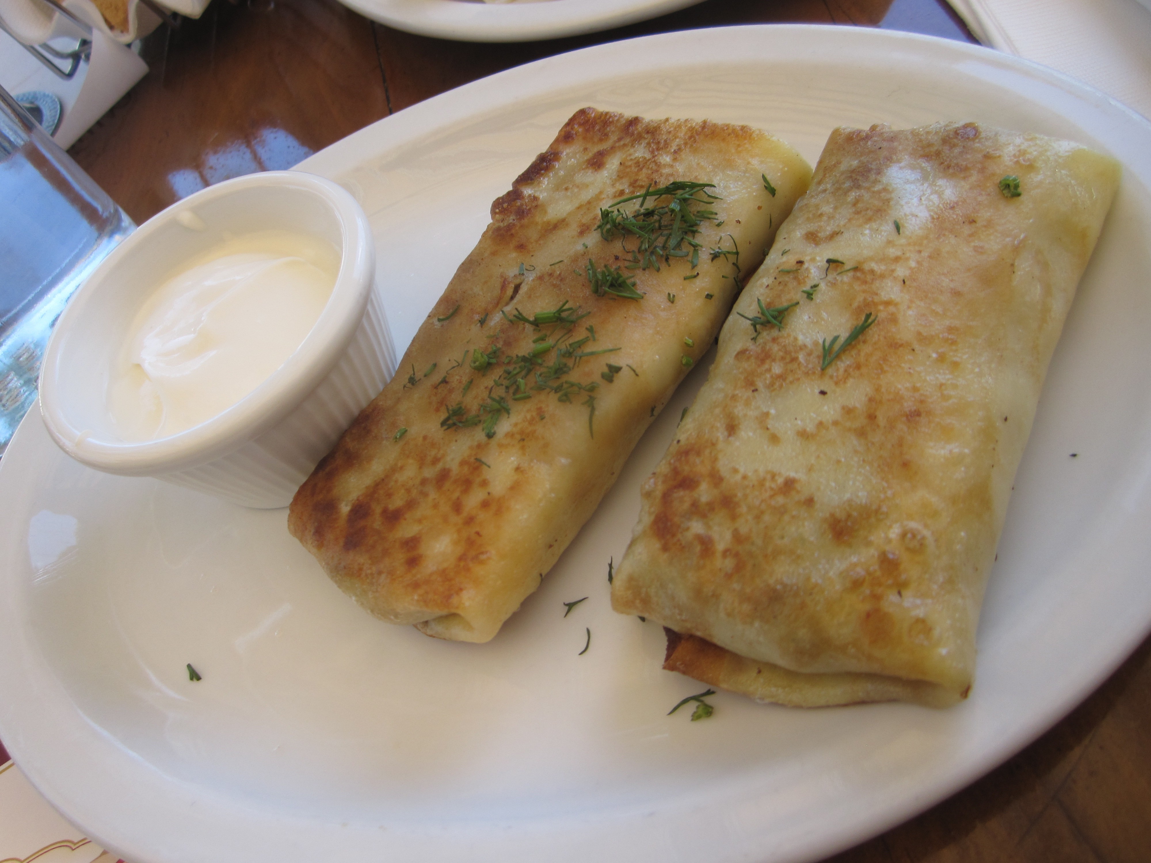 Blinchiki is in the crepe family, filled frequently with caviar (caviar and blinis). My favorite was a blinchiki pre-filled with mushrooms and onions, simmered with enough sage for a forest. Then sprinkled with the ubiquitous dill and alongside the ubiquitous cup of sour cream, the twin parcels of blinchiki are every bit as enriching as a French crêpe or Dutch pancake. The batter seems a touch more sour, a nod to Russia’s rye bread tradition possibly. Cinderella offers salmon eggs as caviar instead of the $150-300 Royal Beluga caviar you may find at high end restaurants in Russia and San Francisco (Gary Danko among the many). The proper way to fill the blini is a 2 to 1 ratio of the sour cream to caviar I learned so that the sour cream absorbs the syrup of the eggs. Be certain that the sour cream doesn’t dominate the eggs however. The showpieces are the blini and the caviar– not the sour cream.