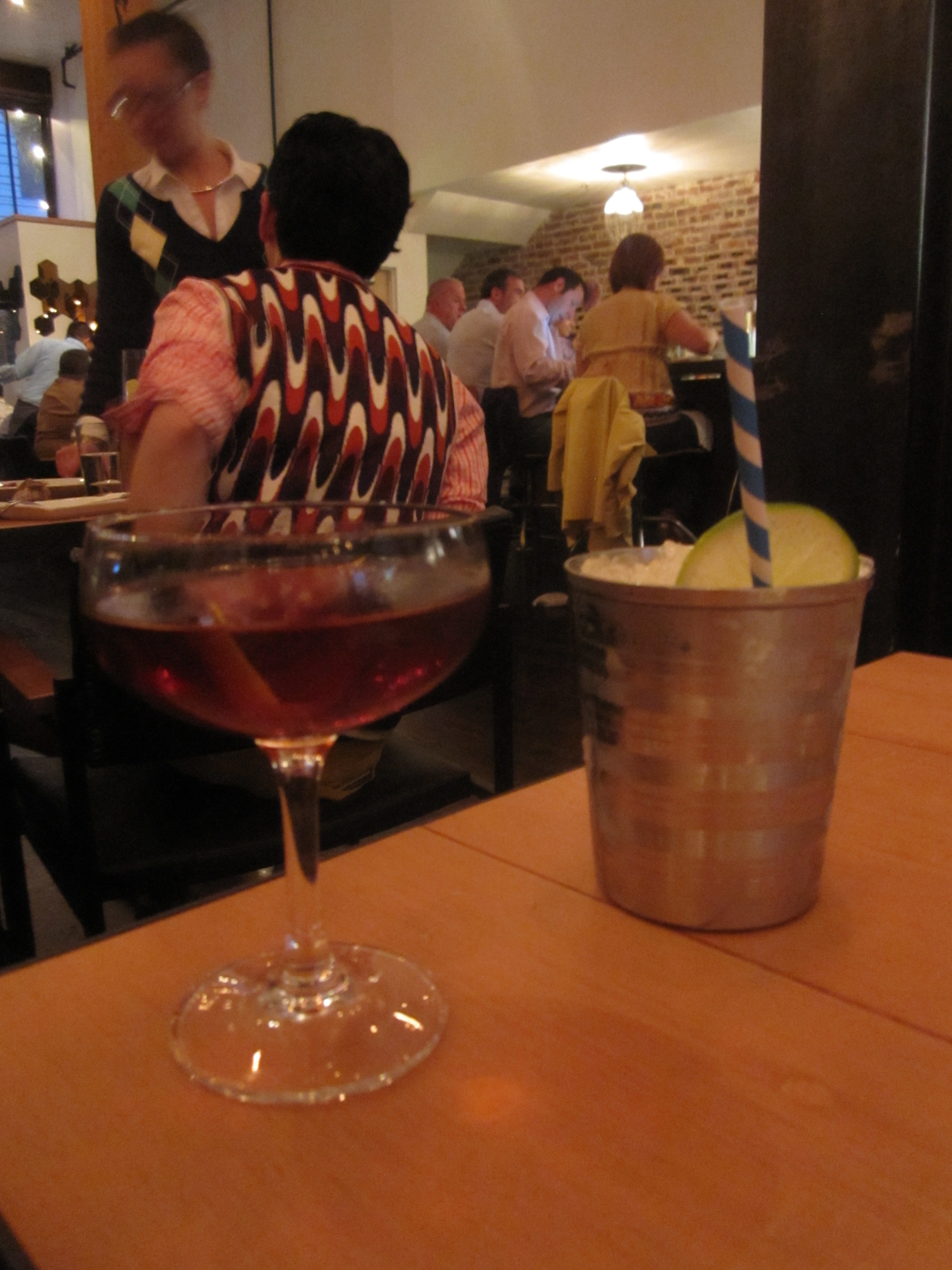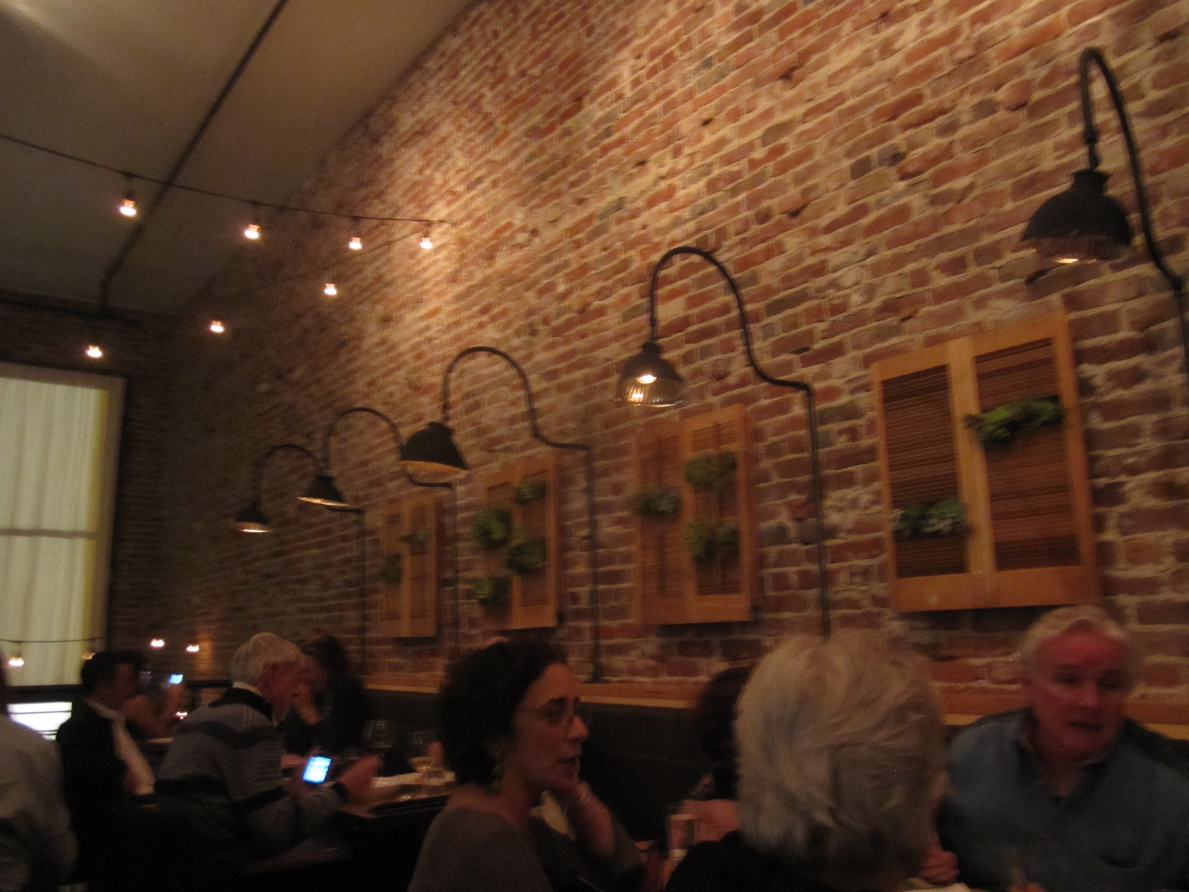 Since its summer, the servers now have pale blue, casual dress shirts, as if AQ were the suave bistro for a wealthy seaside enclave. The chic exposed brick interior receives a rural contrast from trees hanging over the bar that in winter are leafless, but now are happy and healthy, looking as if they were plucked straight from the Santa Cruz Mountains. In the main dining area, cherry wood tables have replaced tablecloths and street lamps and windows complete with closed shutters (must be siesta time) on the brick wall provide quite the juxtaposition where petit village Provence meets urban warehouse edginess.