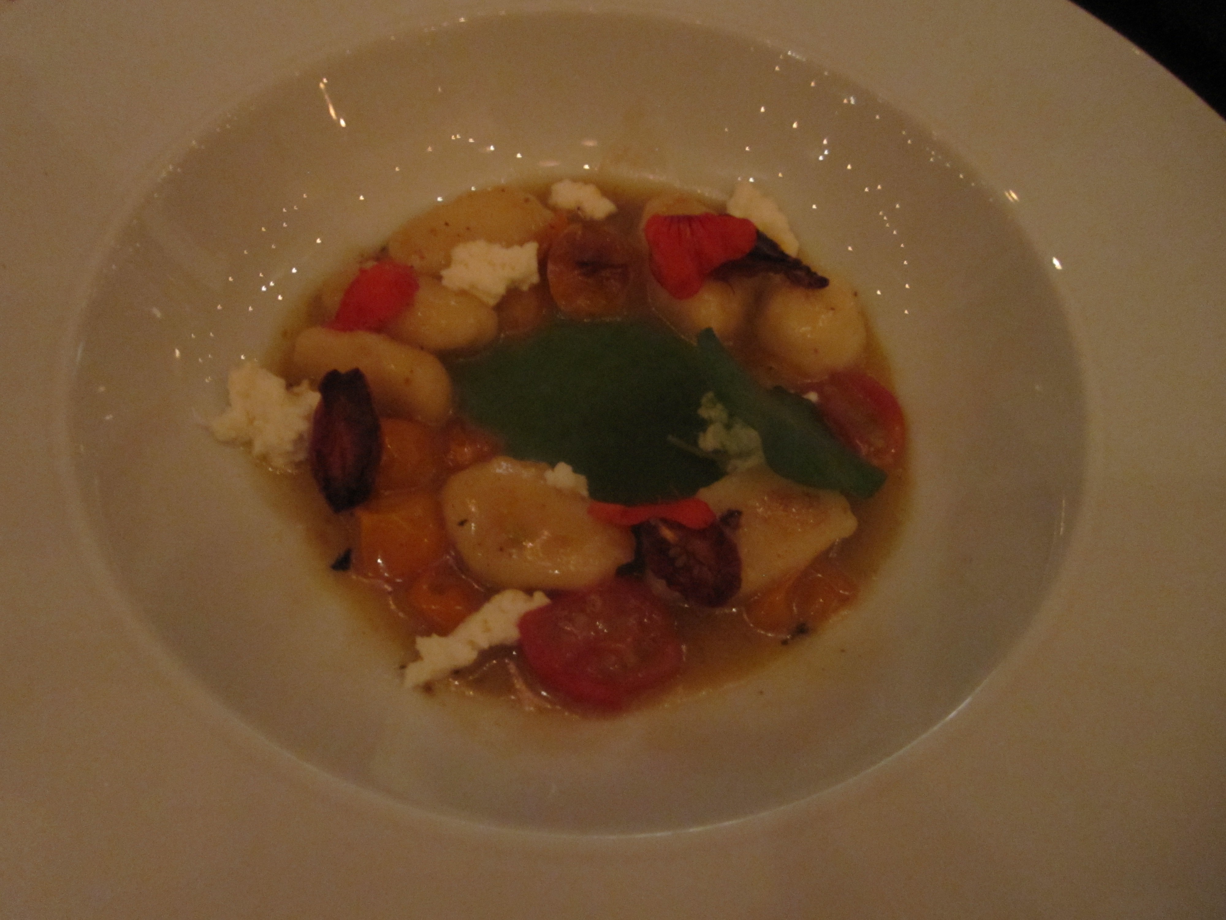 Liberman has a very gentle hand with his dishes, such as the potato gnocchi with a texture as soft as San Francisco’s fog, surrounding a pool of nasturtium puree. Gnocchi seems more appropriate in the winter, often heavy and dumpling-like. These gnocchi have the levity of a Leslie Caron step. A few cheese curds are scattered about, the stratus clouds to the gnocchi’s fog. The star of this subtle, knockout dish are the early season cherry tomatoes concentrated with whey that are 200 percent juicier than the typical tomato. They could fall for being chemically altered. So could the gnocchi. They’re not. They’re just literally bursting with juice, weighing down the whey.