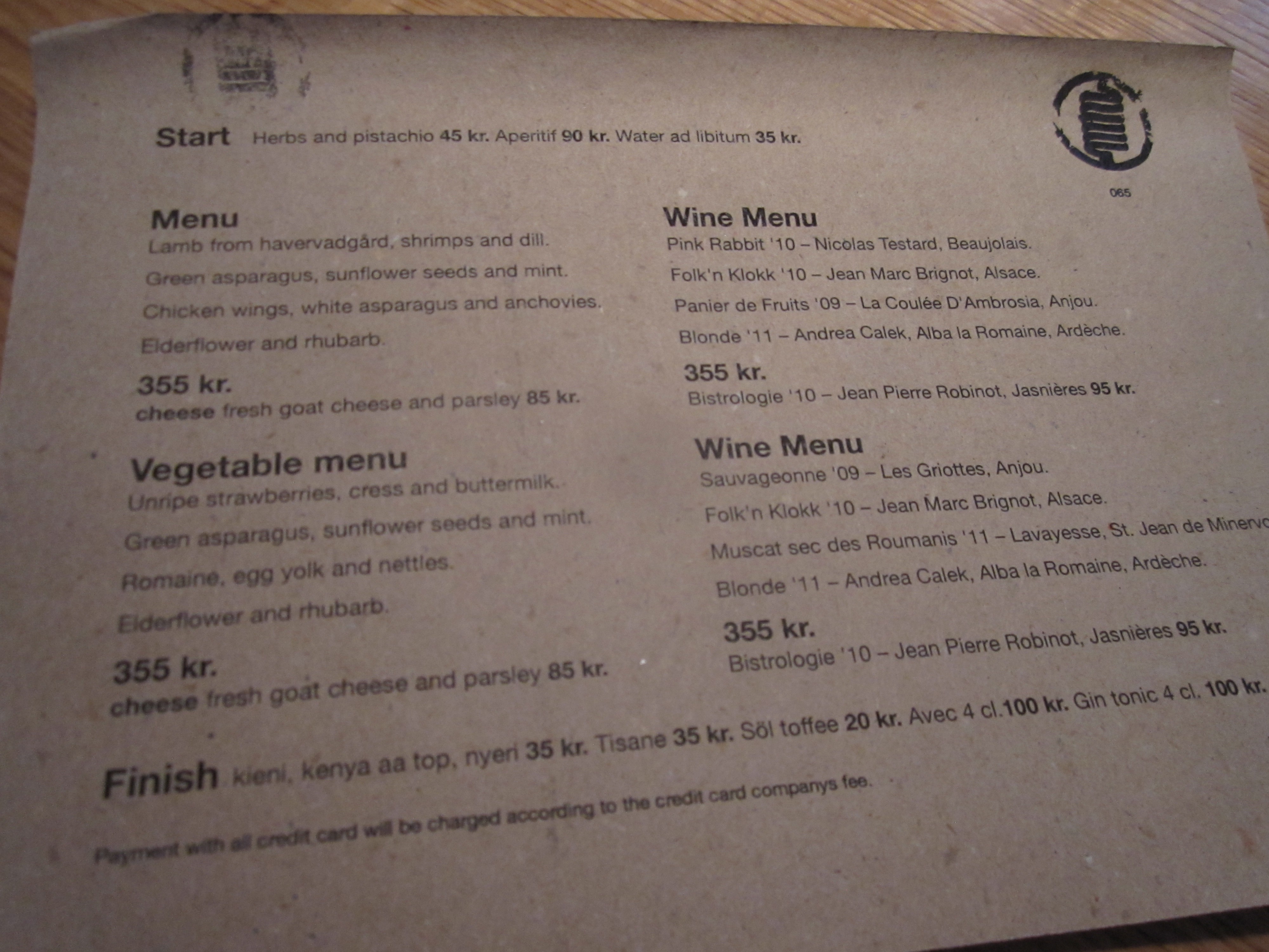Puglisi crafts a pair of four course menus each night for 355 Danish Kroners (an absolute steal at $59 USD), with a couple of special additions to start, such as herbs and pistachios to snack on, or some toffee or chocolate to finish the meal. At least three quarters of the tables seem to go forth with the matching wine pairings. The pairings are the same price as the actual menu, one of the rare times you will ever see such a thing, a comment on what a bargain the food menu is. The menus share a second vegetable course and the same dessert. The meat menu and the vegetable menu differ with the first course and the third (the main) course. A “cheese” course is optional prior to dessert, more on the quotation marks in a moment.