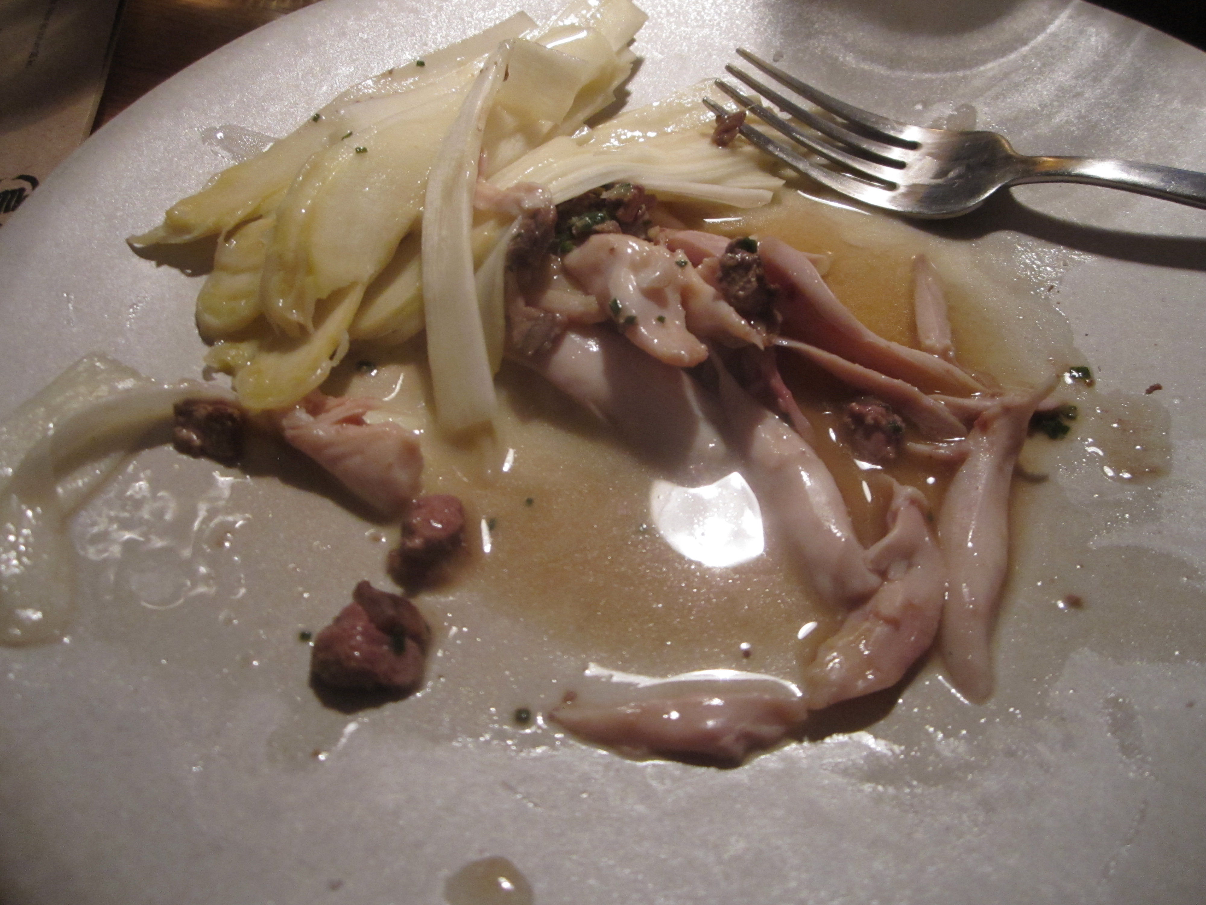 The meat entree was one of those masterpieces where you have a watershed moment thinking how food can reach such textures and tastes, and that a special chef is behind this meal. Humbly called chicken wings, Puglisi presents the tenderest of sliced chicken livers, thighs, and hearts under a pale veil of thin white asparagus ribbons. Butter adds richness, anchovies add some fascinating umami to the equation. I don’t remember the exact technique I was told how Puglisi achieves this velvety texture, but vaporization is one element. The moistness effect is the same as many chefs employ parchment paper to do for fish. It’s the chicken that steals the show, the meat almost melting into the sauce. Even anti-liver advocates at the table were swooning.