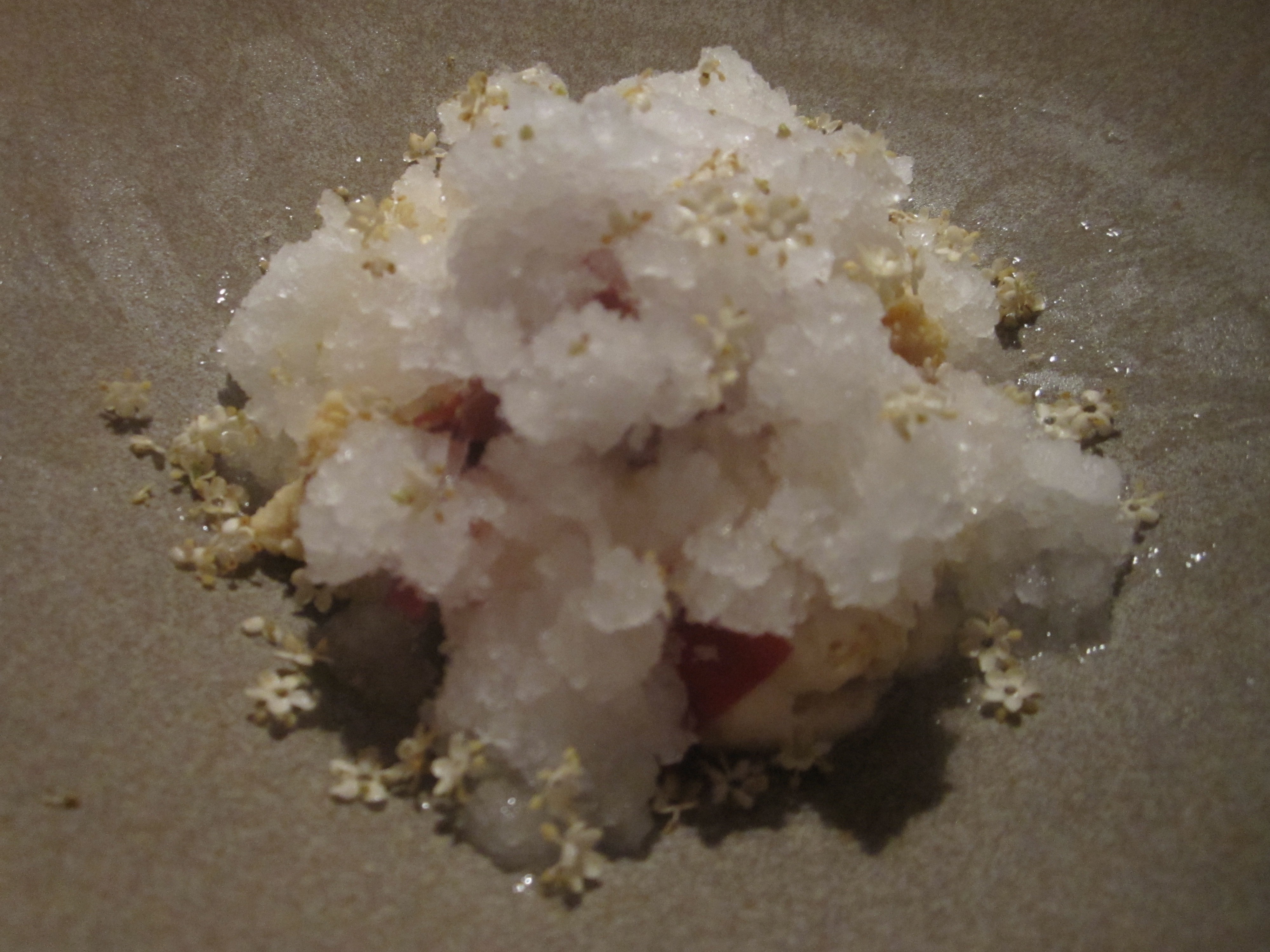 Elderflower and rhubarb for dessert is also quite the innovation, but this time absolutely flawless. Elderflower comes in many forms for a sort of make your own ice cream sundae. There is elderflower infused crushed ice with elderflower cream, mixed together with dehydrated rhubarb and sweet caramelized oats. A few elderflowers are sprinkled over the top. Together, the combinations thrill. Dessert doesn’t get better than this. Chocolate is nothing compared to elderflower and rhubarb I guess.