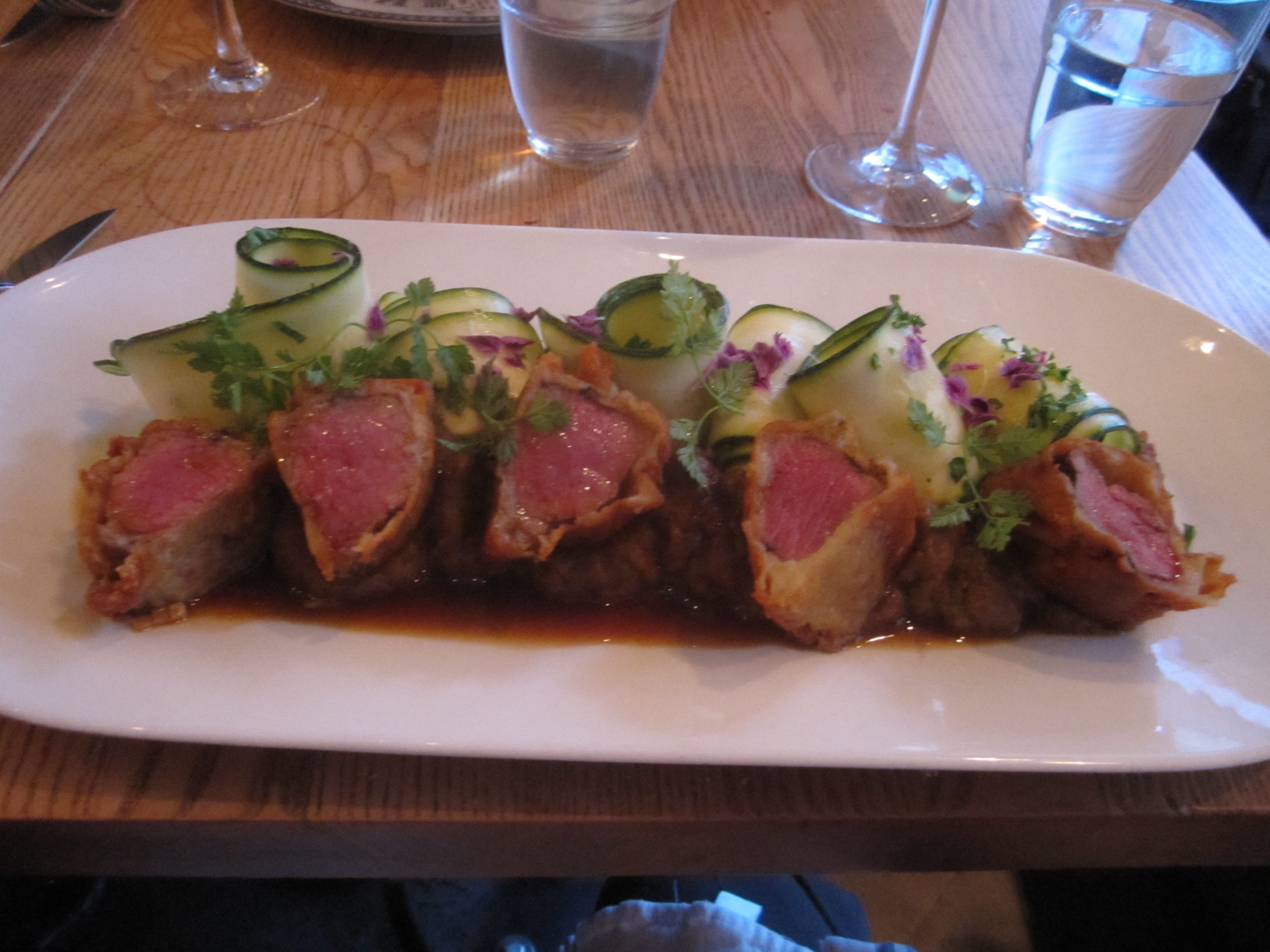 Perfectly pink and as tender as a Peter Luger porterhouse, with a brioche crust wrapped on the outside. The very generous serving reminds you of a beef wellington that vacationed in Nice and discovered ratatouille.