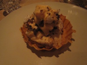 I don’t have a picture of the crispy pork skin and black currant roll snack served at Noma, which would defeat the Hen and the Egg. But here you have the consummate omelette with bitter notes, floral notes, some spice, and some crunch. The real memory of course is that you create the dish yourself…at the world’s “best” restaurant. So I guess that makes me a great chef?
