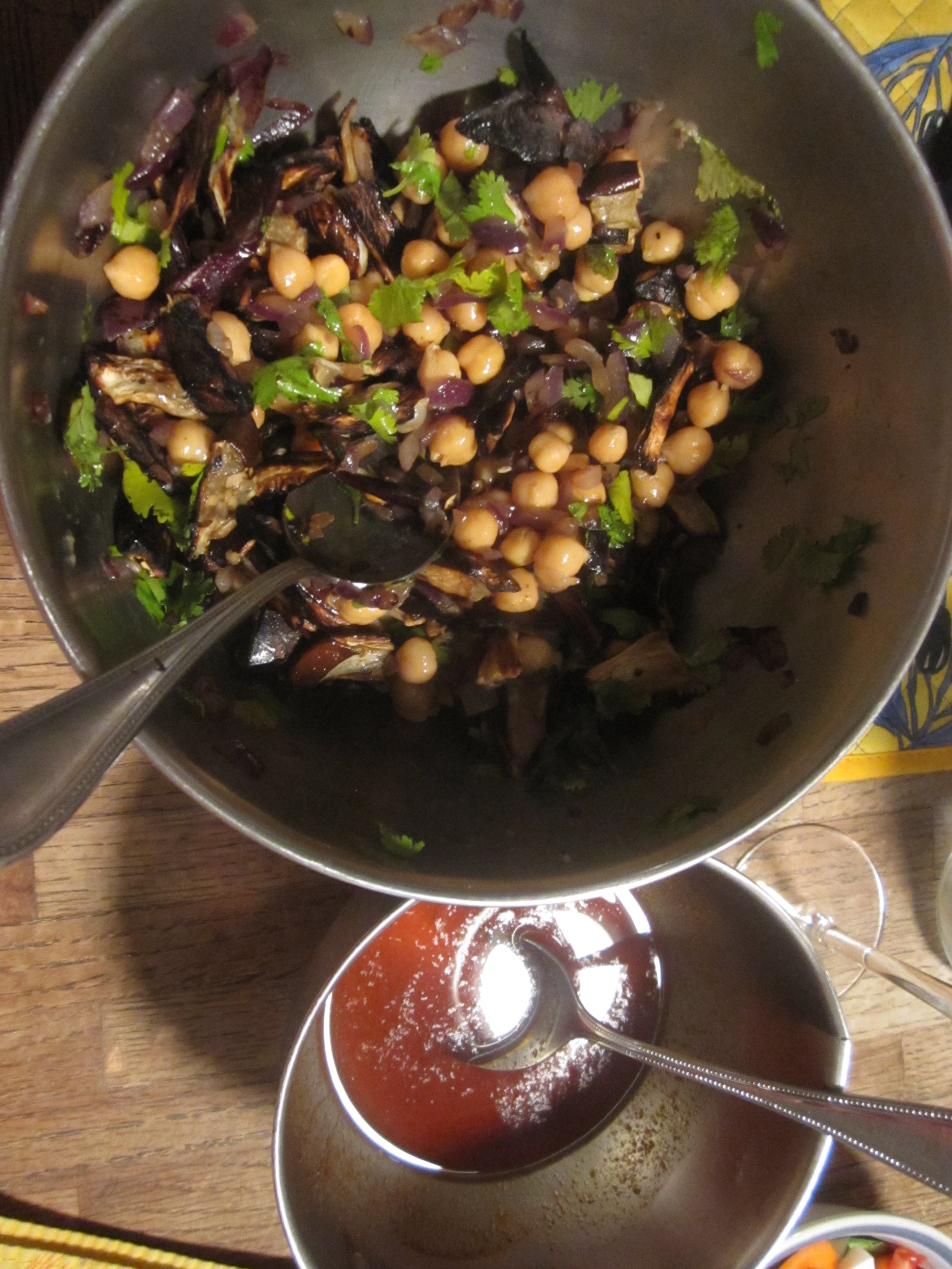 What a side dish for summer, with a little trip to Morocco involved too. As a bonus, keep some grilled eggplant sticks aside for munching on. Maybe dip them in some hummus or salsa. Then impress your friends that eggplant, yes eggplant, is one of the treasures of summer.