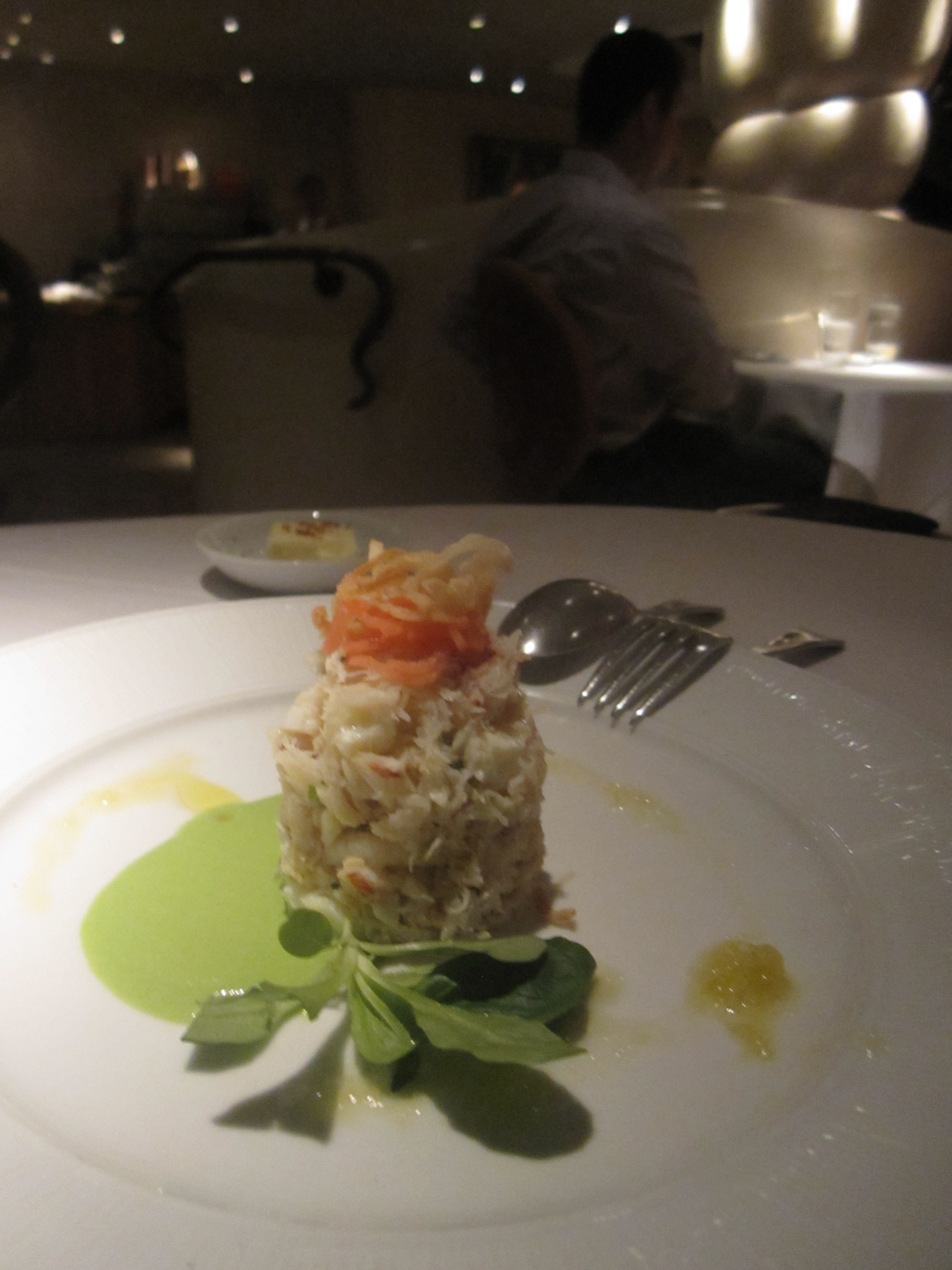 Franz pairs cornmeal crusted Monterey Bay squid with gnocchi and a piquillo pepper beurre blanc, and has both warm and cold renditions of rare ahi tuna. Take your pick: with roasted apricot puree and tempura squash blossoms or with lemon crème fraîche to spread on grilled levain bread. Lately summer produce have been making appearances as one would expect, whether it’s a tasting of heirloom tomatoes in various forms or a summer melon salad with fig reduction and duck prosciutto. I don’t mind the Dungeness crab tower next to an English pea puree. The dish is uninspired though, not showing the imagination many other dishes showcase.