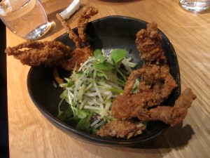 Five of the six courses range from one bite to maybe three bites if you’re lucky. Half of the dishes come from the same sweet-soy flavor profile that works once in the excellent short ribs, but badly falters in the lone substantial dish of chicken with yellow beans. The broth and dry to slightly moist grilled chicken nuggets reminded me unfortunately of the days when you could dine in United’s Economy class. Tomi Björk and Matti Wiberg’s young restaurant shows more potential with a chocolate and avocado dessert, and delicately fried soft shell crab with a cooking daikon apple salad and yuzu-vanilla dressing.