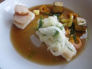 Michelin starred Luomo shows flashes of promise as well, yet ultimately suffers from missing the key component that sends an interesting dish to the next level. Jouni Toivanen’s cooking no doubt is a display of sensational creativity. He also has fallen in love with all of the radical high end dining trends: vague menu names, dishes with more elements than you’ll ever remember, marrying famed dishes from exotic lands, and giving them a local voice. I loved the bulgur chickpea and Moroccan yogurt preparation for “lamb Marrakesh,” but the lamb itself was somewhat bland. As exciting a “xoco and blood” dessert sounds, no exciting news arrives from a chocolate and ox blood combination of somewhat dry chocolate cake infused with the oxblood topped with chocolate cream. The same goes for another dessert of strawberries and cream, where the two switch roles over the course of two small dishes. The only full knock out dish was Toivanen’s take on bouillabaisse.