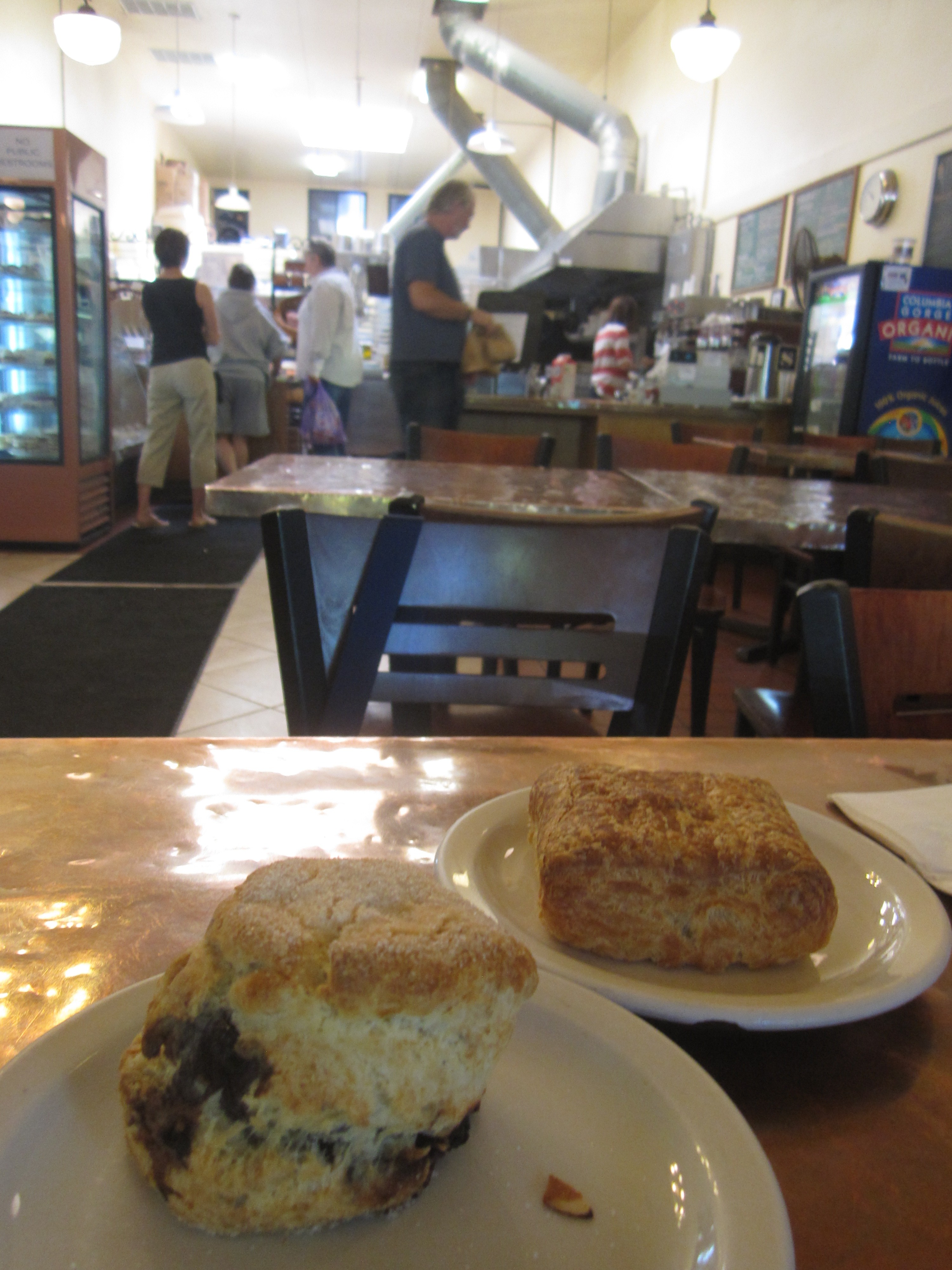 The south side of the plaza is somewhat quieter leading to the ever popular Napa Valley favorite Oakville Grocery. Further south on Center Street is the restaurant bar Barndiva and anchoring the east side of the plaza is breakfast/brunch central, Downtown Bakery & Creamery. Lines here are inevitable. Go for the sticky bun of your dreams and a delightful peach galette. Scones and pain au chocolat needed more butter and blueberries/chocolate.