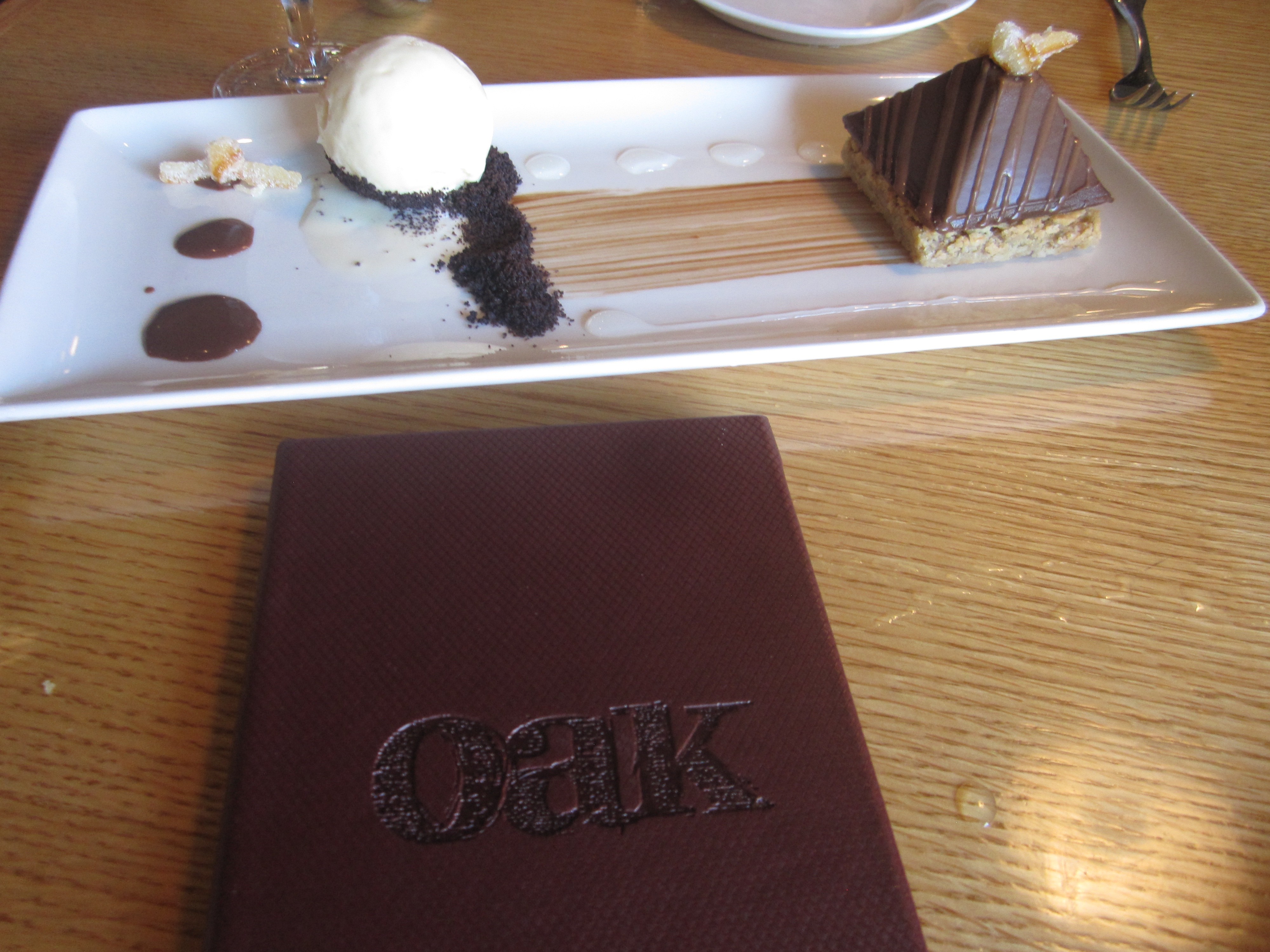 Oak: Gianduja Chocolate Panna Cotta with Hazelnut Blondie, Candied Orange, and Patron Citronage Ice Cream
