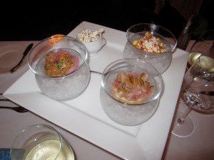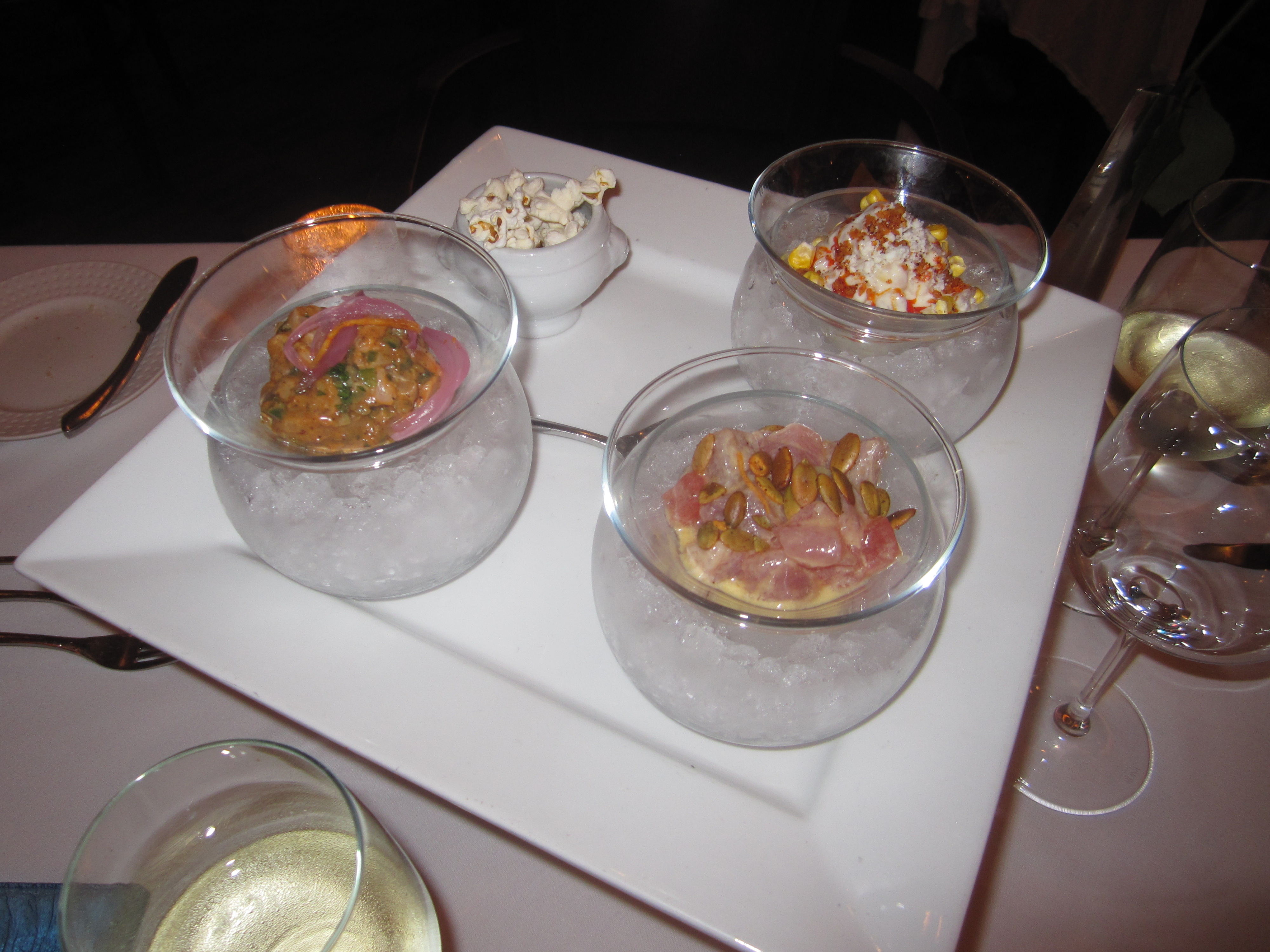 Stephan Pyles: Trio of Ceviches: Ahi Tuna with Watermelon and Pepitas, Salmon Veracruzano with Capers, Green Olives, and Jalapenos, Snapper with Smoked Corn and Chile Pop Rocks