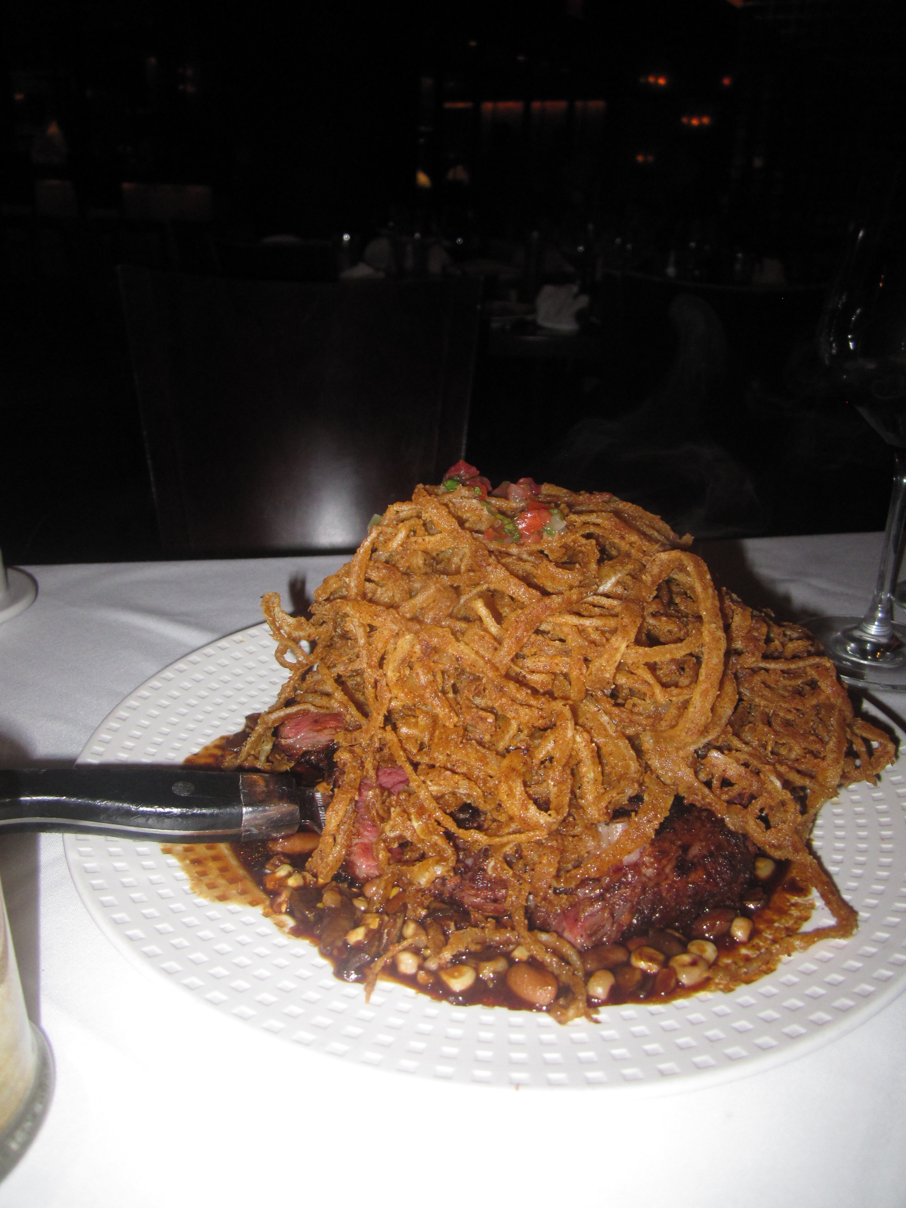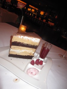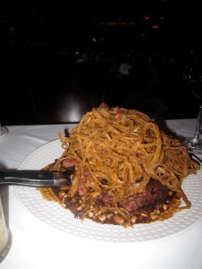 Yet Pyles’ 12-ounce, bone-in Cowboy Rib Eye comes hidden under 12 more ounces of soggy onion rings and an acre of pinto bean-wild mushroom ragout. Some parts of the steak are Peter Luger tender, but too many bites were of gristle. The signature “Heaven & Hell Cake” veered more towards the latter, making those Cheesecake Factory cheesecakes seem exciting and as dainty as teacakes. A bland stack of layers of angel’s food cake and devil’s food cake could not be saved here by the layers of peanut butter mousse and a wan chocolate ganache. A meal at Stephan Pyles starts with such promise. Then what was a serious dining experience becomes downright comical. It’s too bad.
