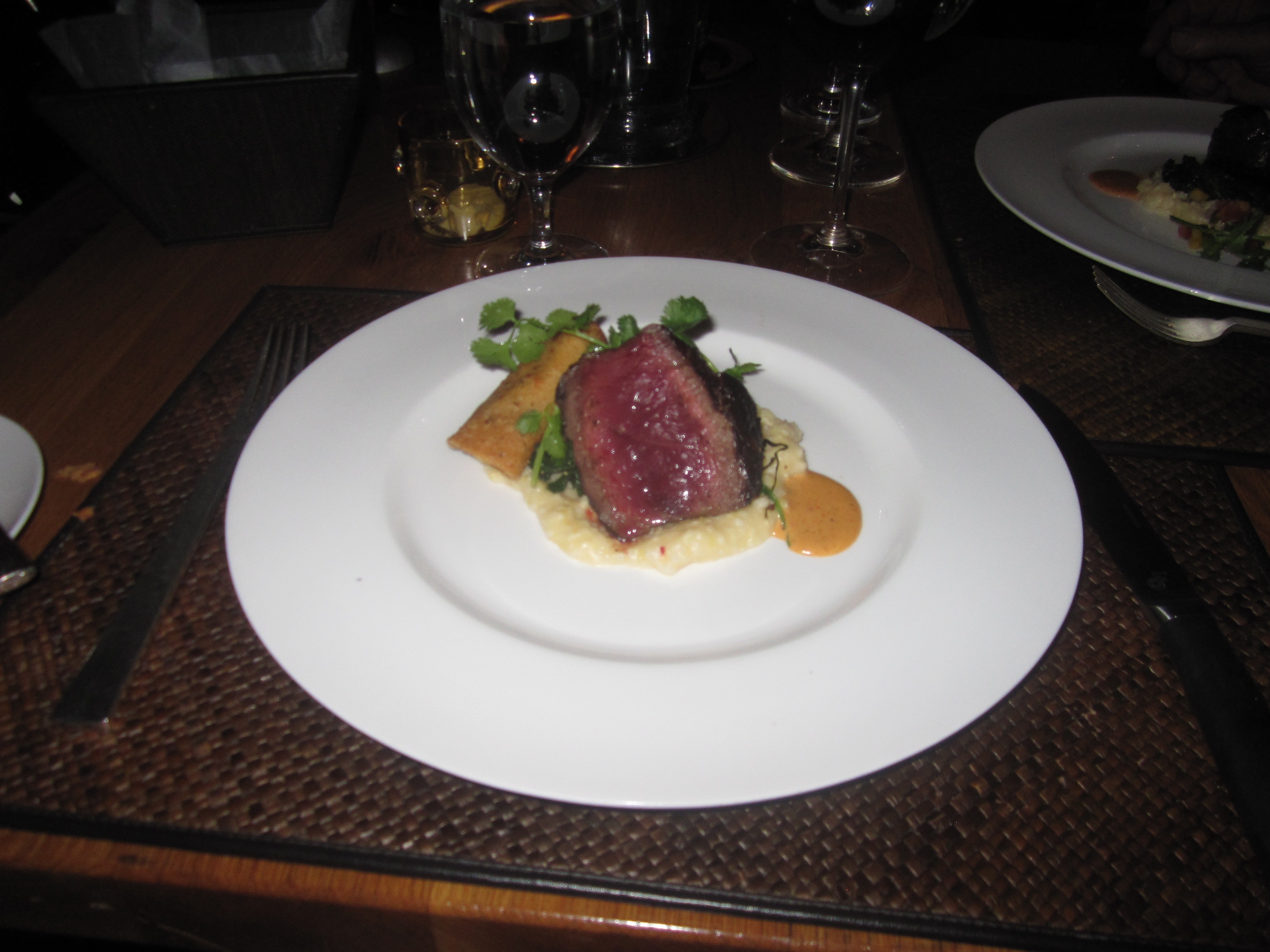 Here, an argument could be made for buffalo’s supremacy to beef. There’s no need for the taquito. Meat doesn’t get any more robust or tender than here. A beautiful, toro tuna ruby colored rare to medium rare. Or as the French love to say, saignant. The grits are borderline out of this world.