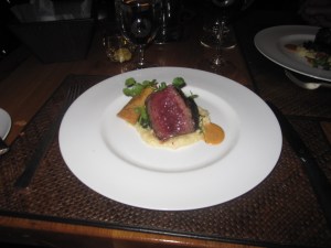 The two rooms make everyone look beautiful. The front room seems straight out of a Jane Austin countryside manor in lush drapery. The main room is rocking, boasting a slick modern edge and the open kitchen that manages to not be too loud. It’s incredibly strange that the service staff wears jeans and dress shirts with an awkwardly popped collar, while the dressed up crowd is sporting their best cocktail dresses and sport coats. At least the diners dress to impress. Just focus on the scene and the Fearing’s cuisine.