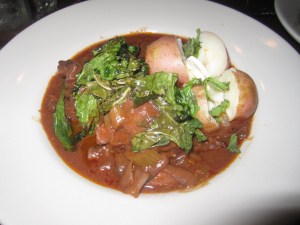 The service reflected this gusto, first taking a half hour to bring a drinks menu then bringing dishes too quickly. During the lunch rush, we had three different servers, nobody knew who was in charge of us. So the water kept coming and coming. When the tables cleared, it became clear who would be our actual waiter. Everyone took a deep breath. The meal then was mostly terrific.