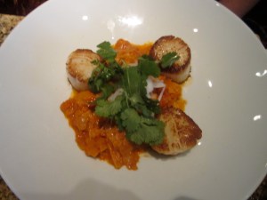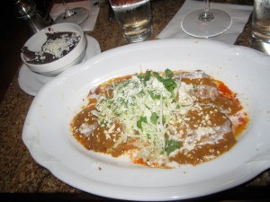 Del Grande’s watery, bland tortilla soup made one dining companion yearn for the version at Wolfgang Puck’s airport cafes. The signature RDG Margarita is passable, if a very unspectacular rendition. Sashimi of yellow tail paired with avocado could be found anywhere, until it gets livened up several notches by a red pepper ginger sauce. Del Grande’s talent is on best display with those rabbit mole enchiladas, the mole with as much depth as oil drilling platforms in the Gulf, and the lettuce slaw is no ordinary cole slaw. Best of all in the dish? The refried beans with pork lard. Hey, this is why lard should still be used. These are the first refried beans I’ve ever applauded.