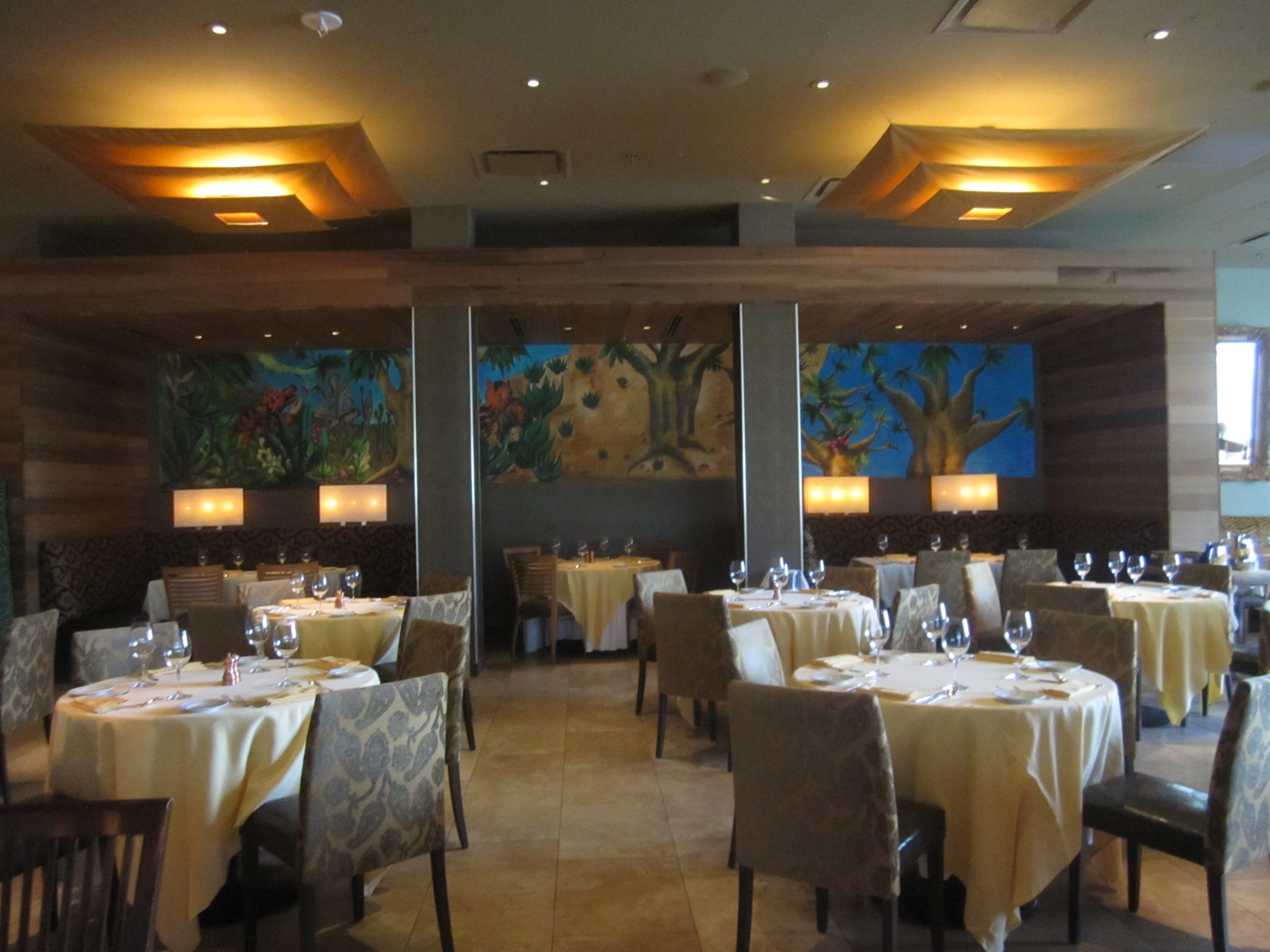 That is followed by the luxurious, spacious grill room with a nearly room wide canvas painting of a tropical forest, and couch banquettes and leather seats that would be right at home as the Grill Room at London’s Savoy Hotel, except the wood paneled ceiling wouldn’t fit the Savoy. The hectic kitchen is mostly visible from both dining rooms, leading to a constant rushed feeling in the restaurant. You are never completely at ease.