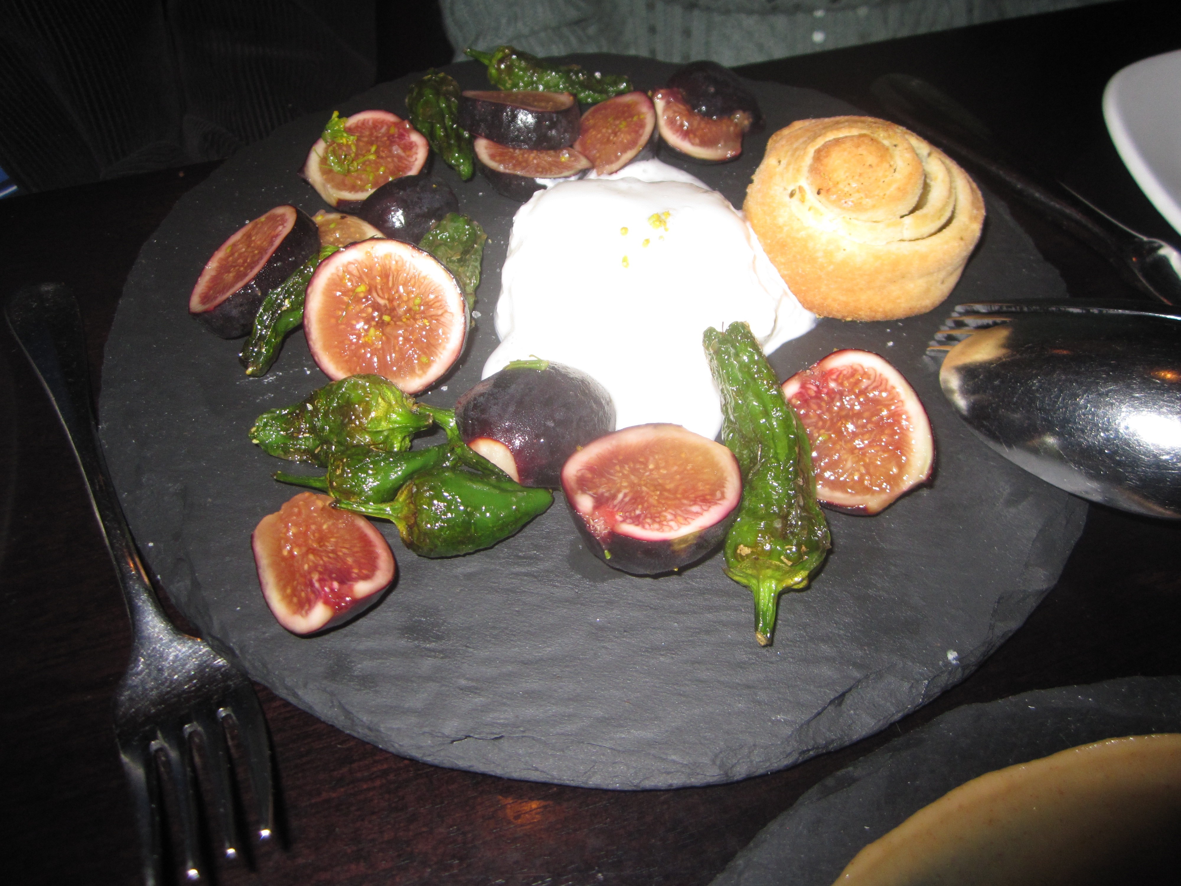 SPQR, San Francisco: “Insalata di Estate:” Figs, Burrata, Padron Peppers, Wild Fennel Bun, and White Balsamic