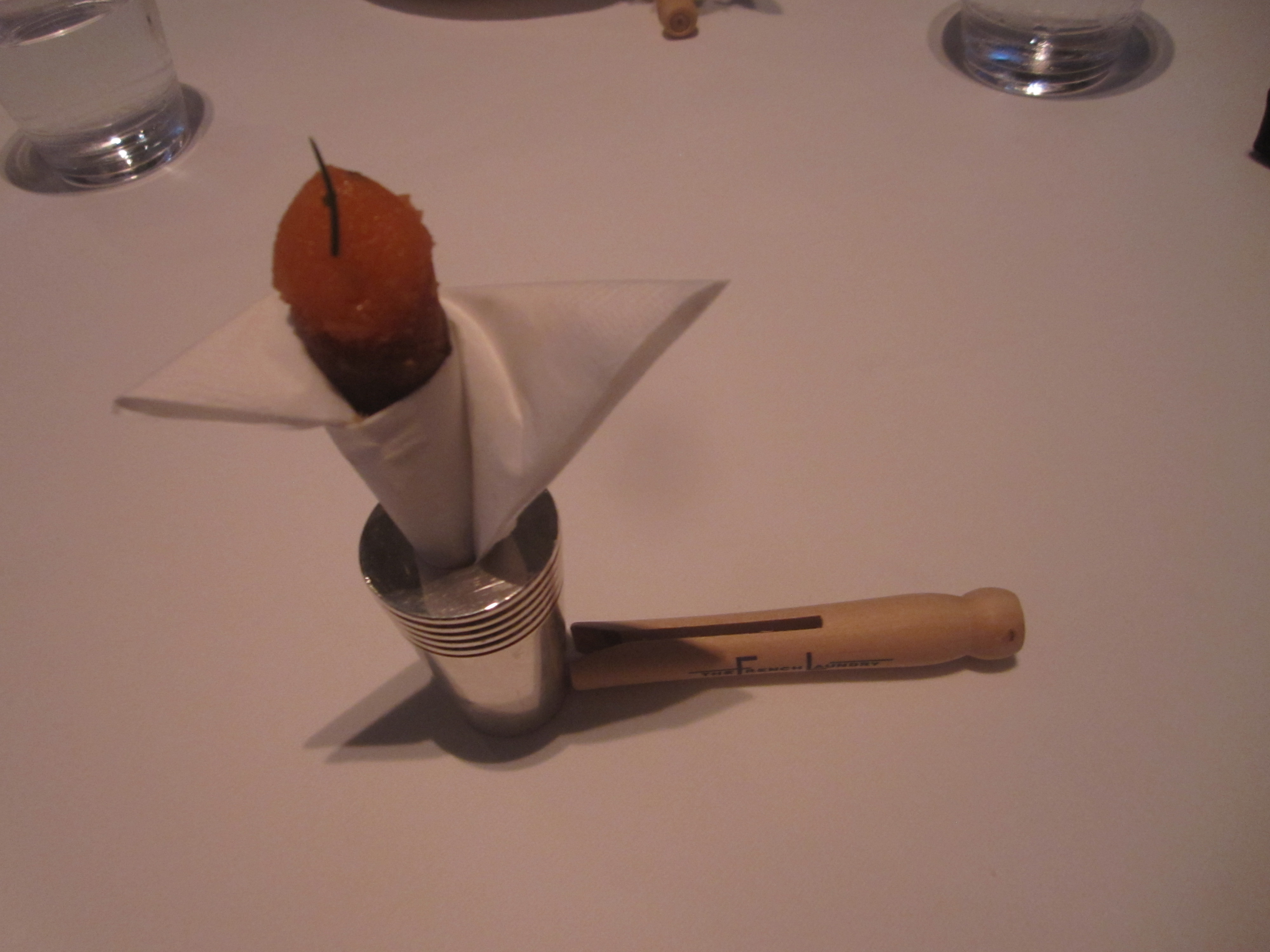 You’ll probably linger over a little Calvados snifter or a Dow’s 20-year Tawny, when the check discreetly arrives as an old laundry receipt. To soften the blow, a small tin filled with four superb sugar crystal dusted shortbreads arrives. Those silver tins are of course imprinted with the restaurant’s signature old clothespin logo. You could probably sell one for $20 on eBay.