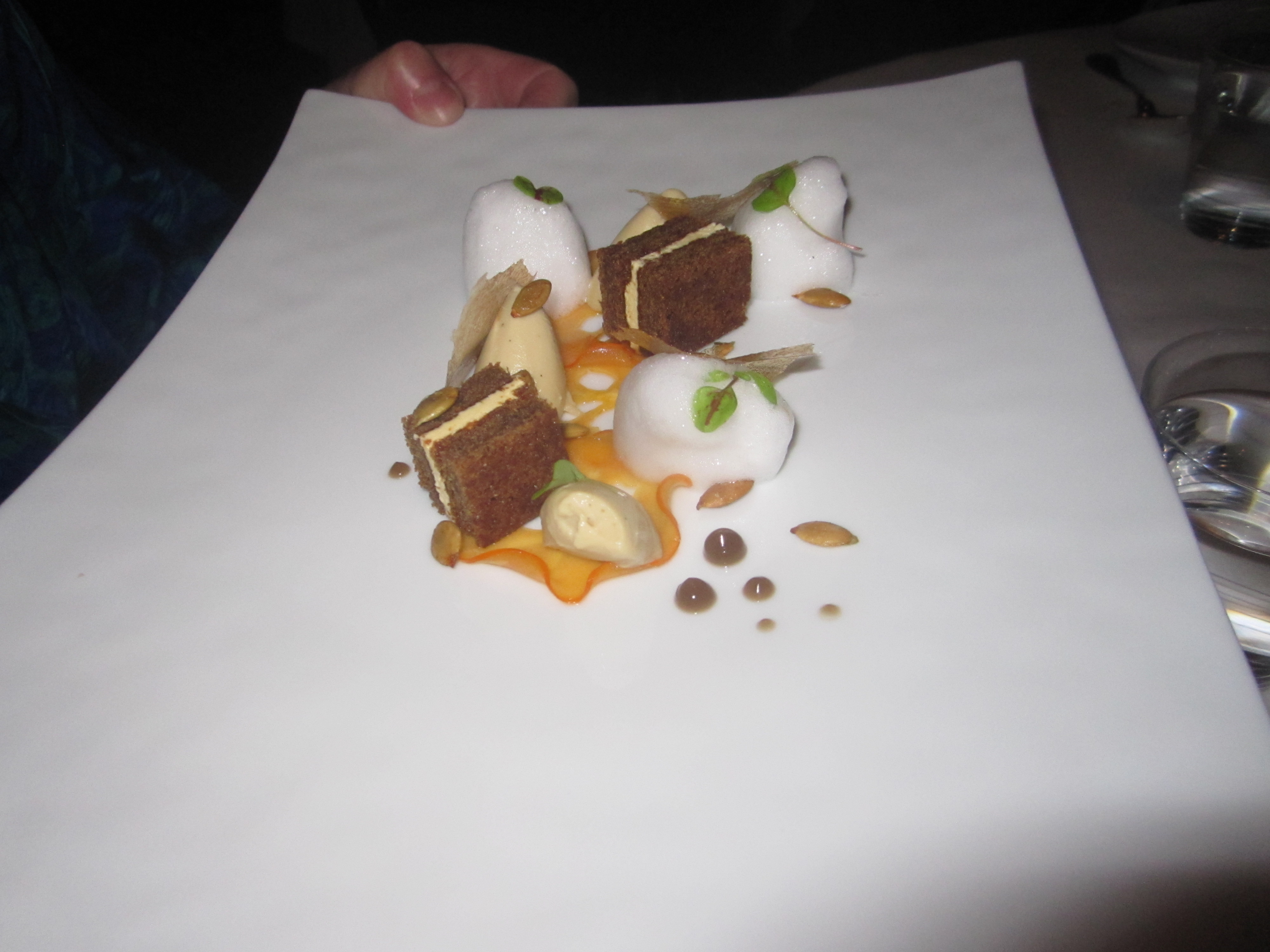 Well, then again I might ask for the “Jamaican Gingerbread” on the Vegetable Tasting menu– a de-constructed carrot cake of sorts. Twin sandwiches of gingerbread with a Muscovado custard building might soon be sold at Bouchon Bakery. The pair lie next to thin star-fish evoking slices of somewhat tart confit persimmon, grown in Abel’s backyard. If only my backyard persimmon tree could grow these. A few pepitas (pumpkin seeds) are scattered about, with scoops of citrus buttercream and ginger foam piles. A work of art, to be certain. A knock-you-over-with-sugar dessert? Not hardly. There is such meticulous care in every aspect of these creations, which are truly the meaning of edible landscapes.