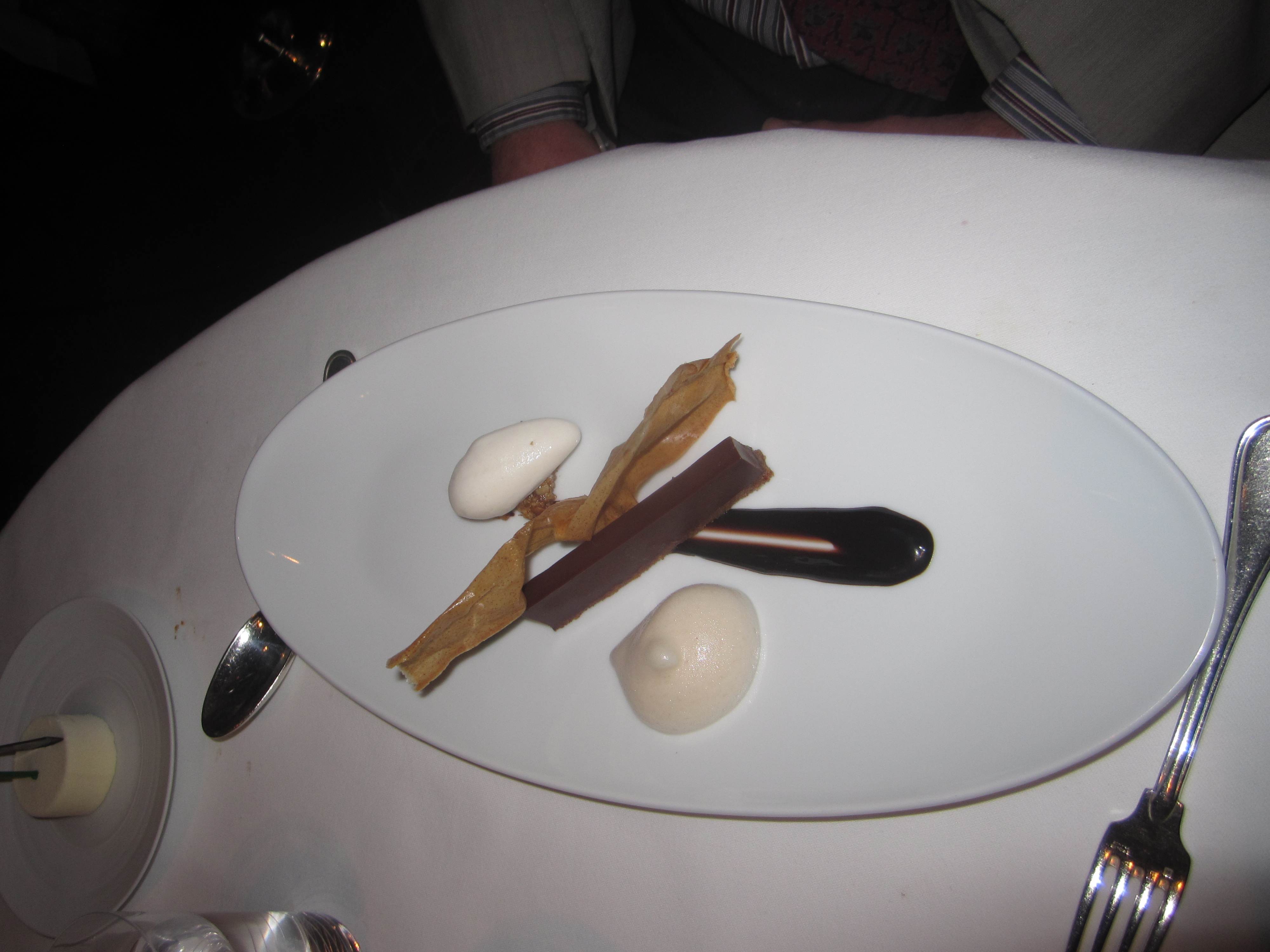 It is a spot-on dessert, subtle, and thought- provoking. But it won’t be anybody’s favorite. There is no defining “wow” factor. That instead will almost certainly be a dark chocolate “torte” whose centerpiece is a strip of robust ganache over even darker chocolate sauce. Next to the sauce lies a cinnamon brittle that could pass for a crumpled-up bow tie. The dish is finished with pecans, banana ice cream, and the real show-stopper, a cinnamon whip that looks like whipped cream but swiftly transfers into a light-as-air foam. It’s everything you could ask for with dessert.
