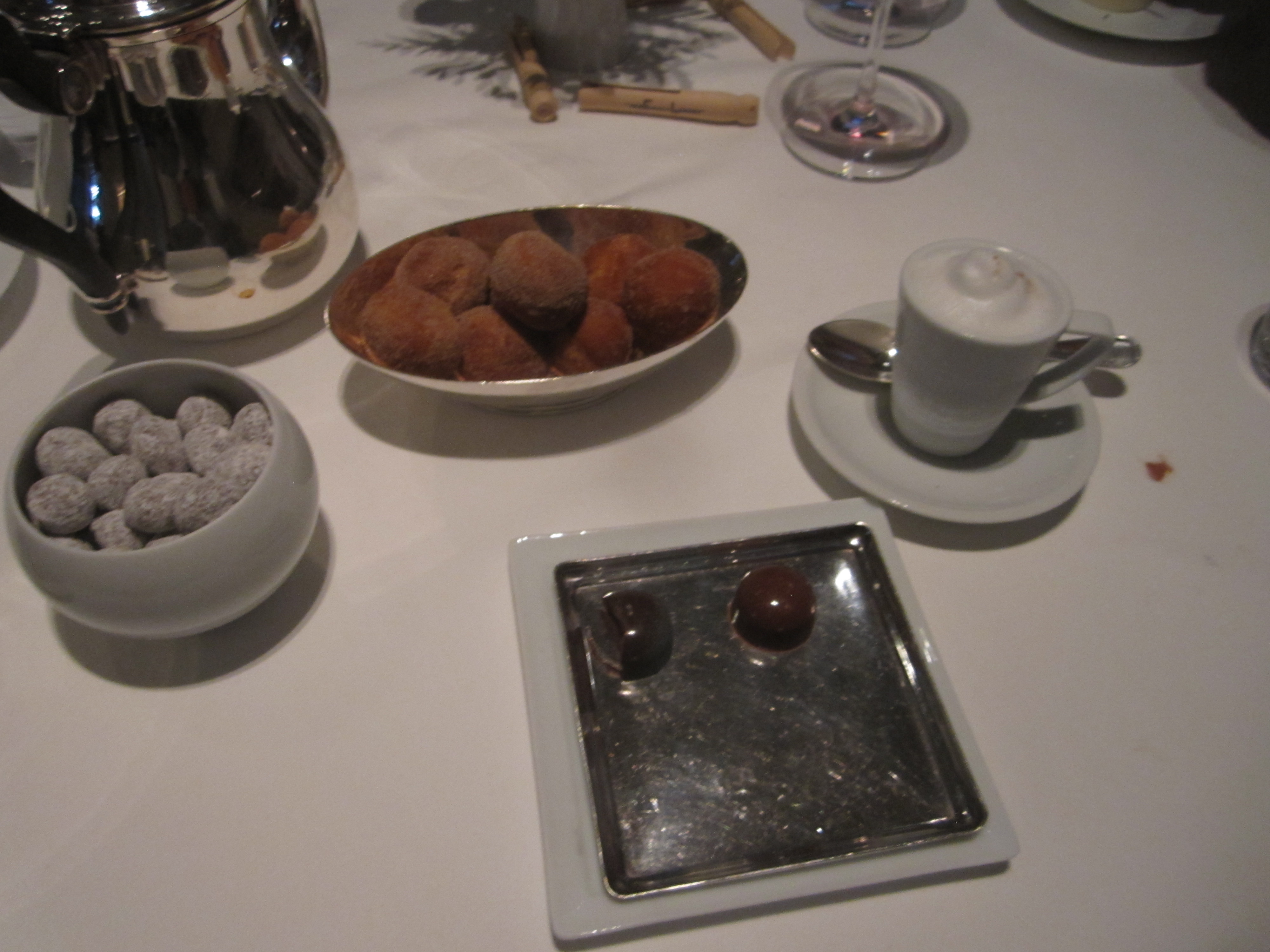 As the meal winds down, on comes the parade of mignardises. A parade it is, or the second and third dessert courses if you will. First, a tray presents endless row after row of Valrhona chocolate truffles, surfaces glazed in myriad colors of the painter’s palette. Next come the famed “Coffee and Doughnuts,” as much a Keller signature as the opening salmon cornet and “Oysters and Pearls.” The dish used to be served individually with a single fried cinnamon beignet filling the middle hole of the same beignet, just doughnut sized. Now, the table receives big bowls of the warm, fluffy beignets, a fitting way to enable you to start letting your hair down back in the real world awaiting in moments. The “coffee” part is more of a stretch than the literal doughnuts. It’s a cappuccino riff, with a base of espresso semifreddo, a mousse-like consistency, in place of the drink’s usual milk and espresso body. Steamed milk foam lingers atop, in this case not mixed as a heart or some other latté art form. Every taste is special, but the real primo ones are for those with the patience to let the foam dissolve into the semifreddo.