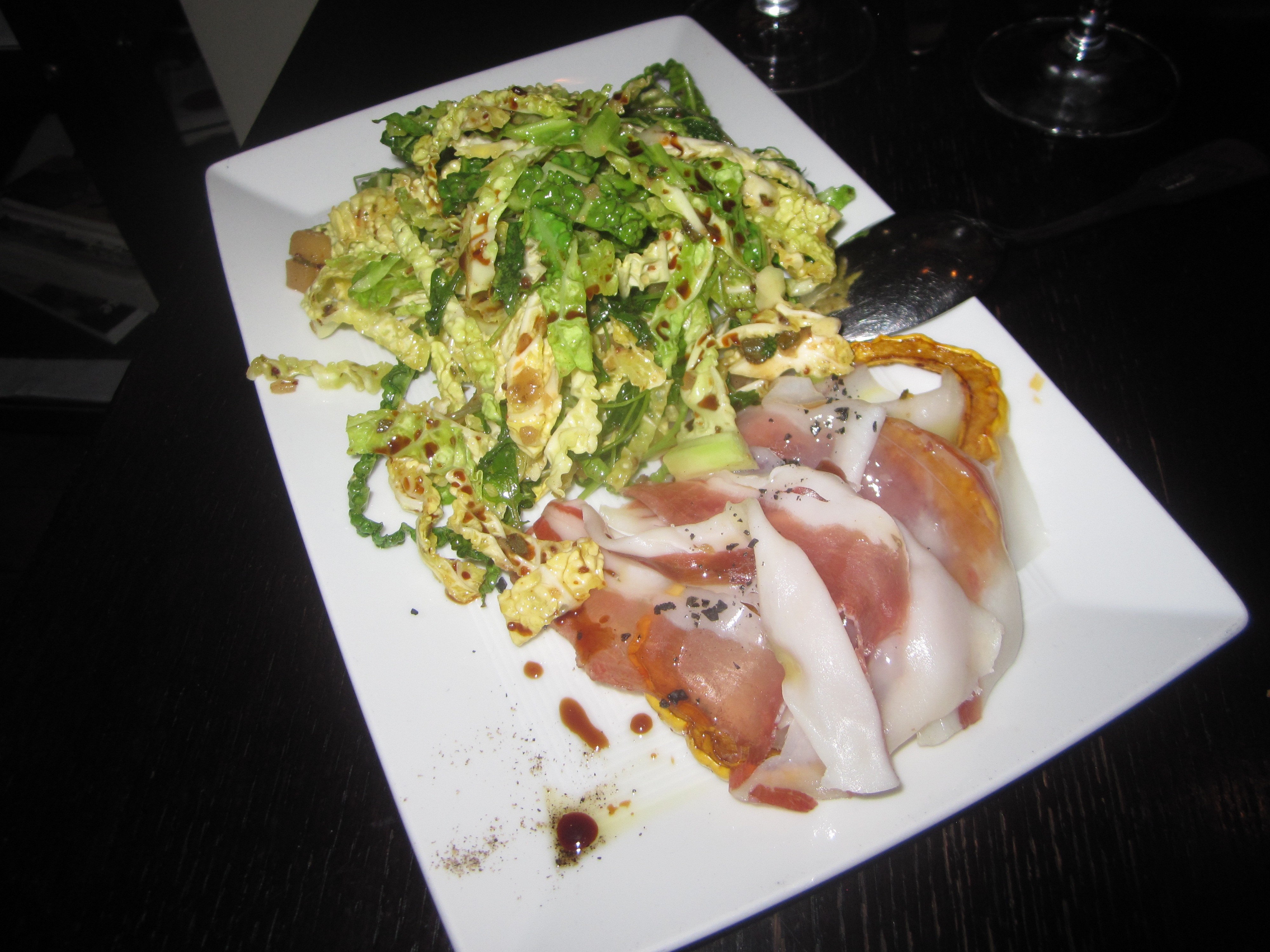 Back to the larger plates, with usually two pastas on offer. The heavily advertised by the waiter dish was a pappardelle that proved to be the kitchen’s only clunke. Its perfectly fine, but unspectacular addition of braised duck legg, butternut squash, and Brussels sprout leaves lacked the vision of Paley’s other dishes. The promised shaved foie gras torchon either was missing or had so little effect it was irrelevant, not a commonly seen trait of foie gras.