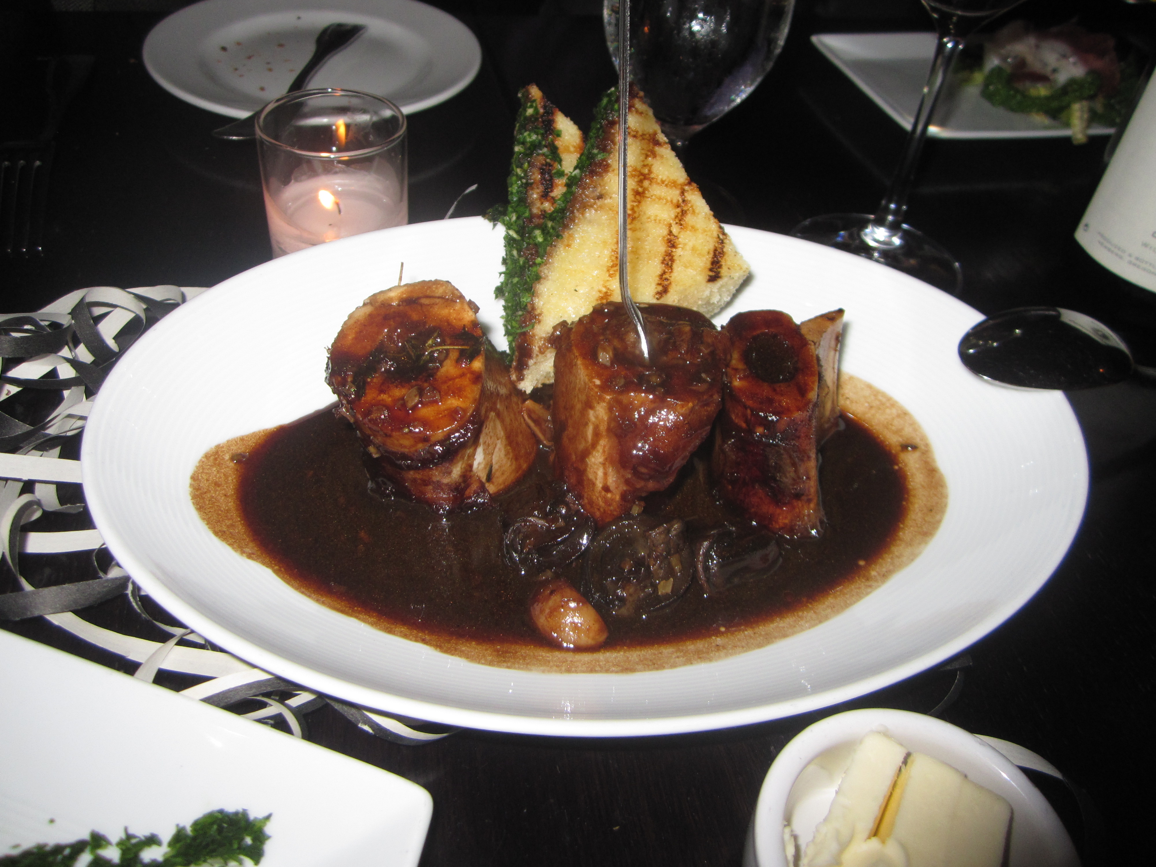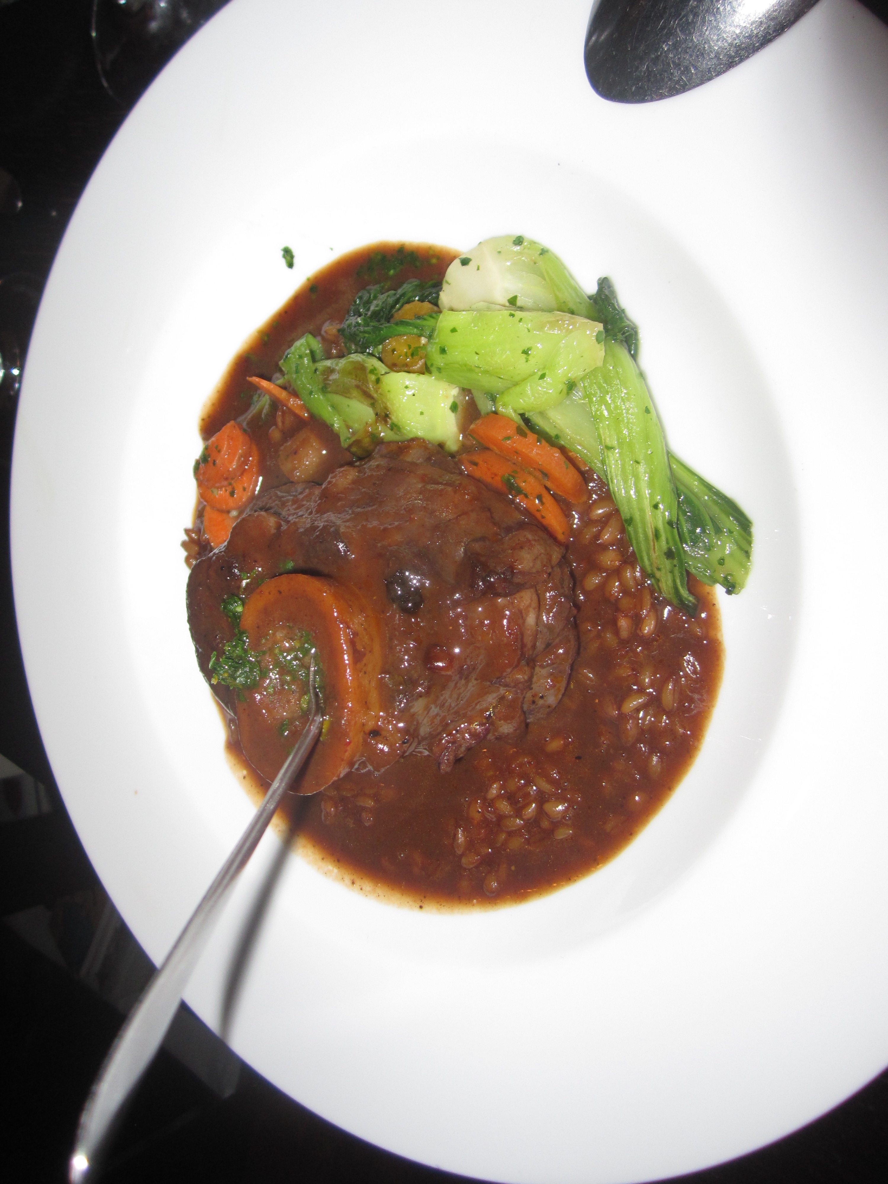It’s hard to award the gold amongst the three “mains” where there is no “half” option. Fortunately, all three were the unanimous stand-outs on the medal podium for the evening. Veal osso buco never had it so good, brightened by a blood orange accented gremolata, bok choy, and Emmer Farro braised in a red wine sauce not unlike the Bordelaise in the escargots starter.