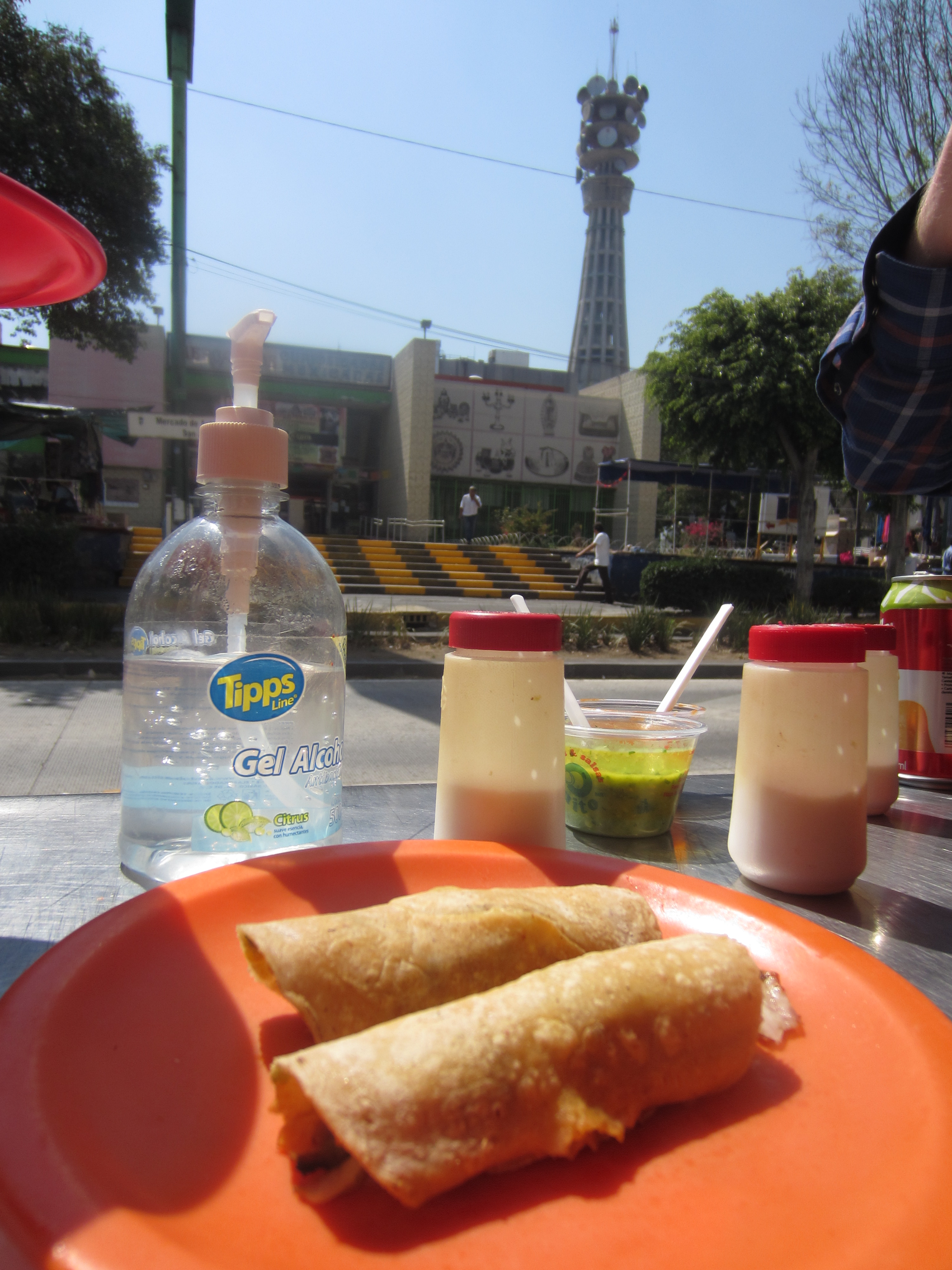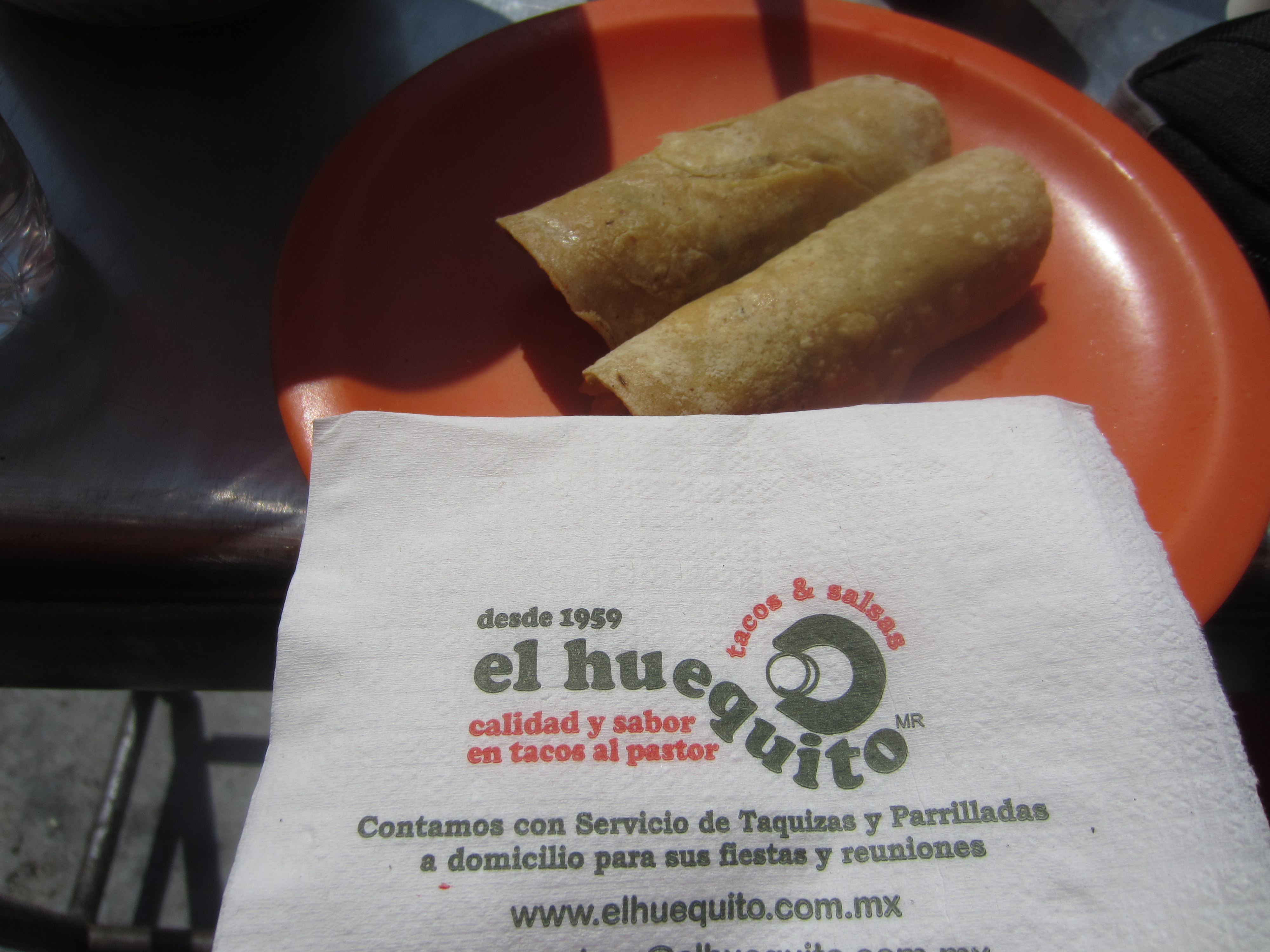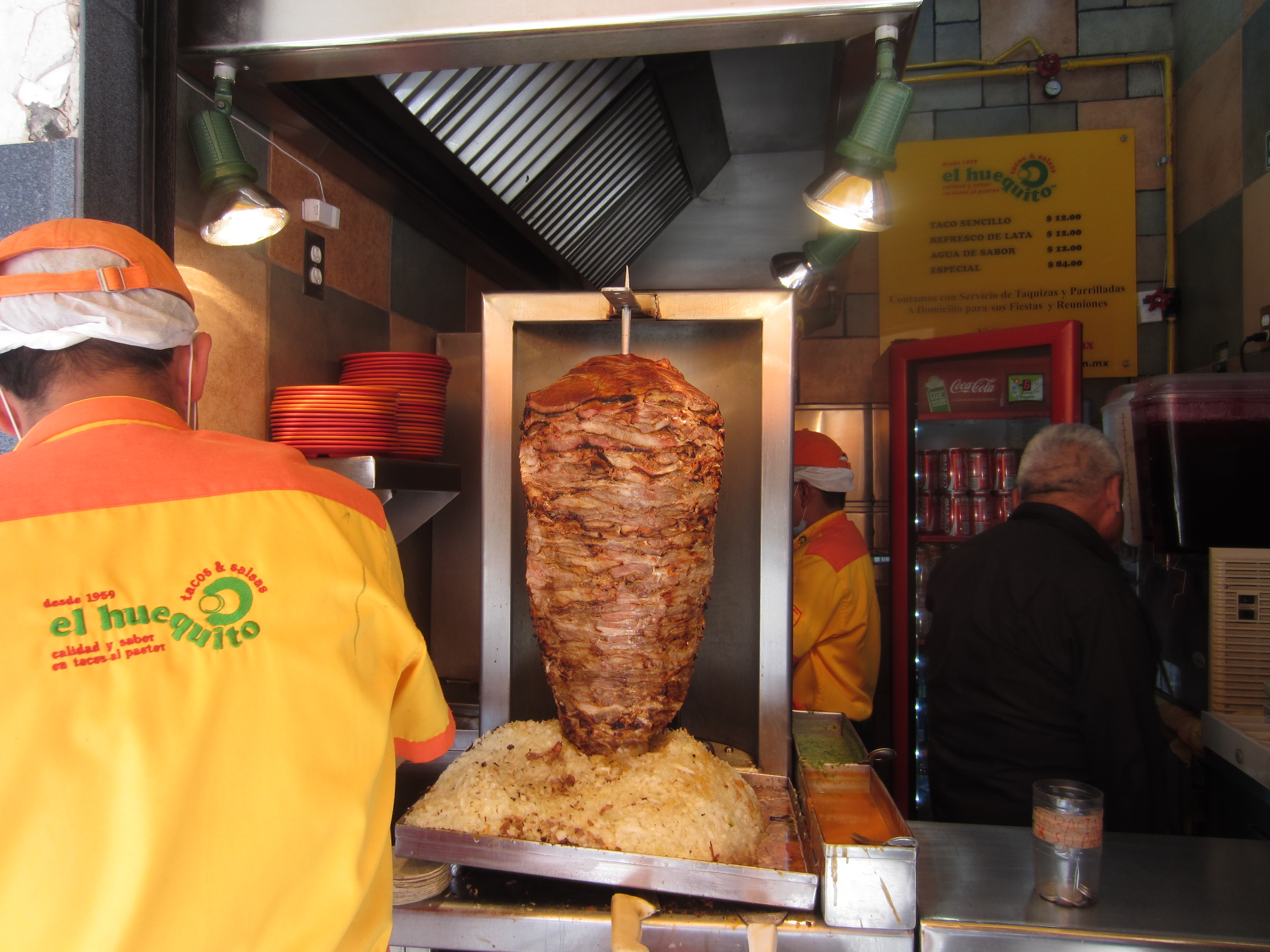 Tucked into the heart of the chaotic Centro Historico not far from the Torre Latinoamericana (“Mexico City’s Empire State Building”), you’ll finally spot El Huequito with its bright yellow awning, a portable table with two types of salsas and room for maybe three plates, and of course, the alluring rotisserie spit. I like to consider myself a “savvy traveler,” but I couldn’t find the place after numerous circles until I asked a very kind police officer for guidance. It turns out that I had been mixing up the street number for a nearby ceviche place with the street name of El Huequito. Well, I made it anyhow.