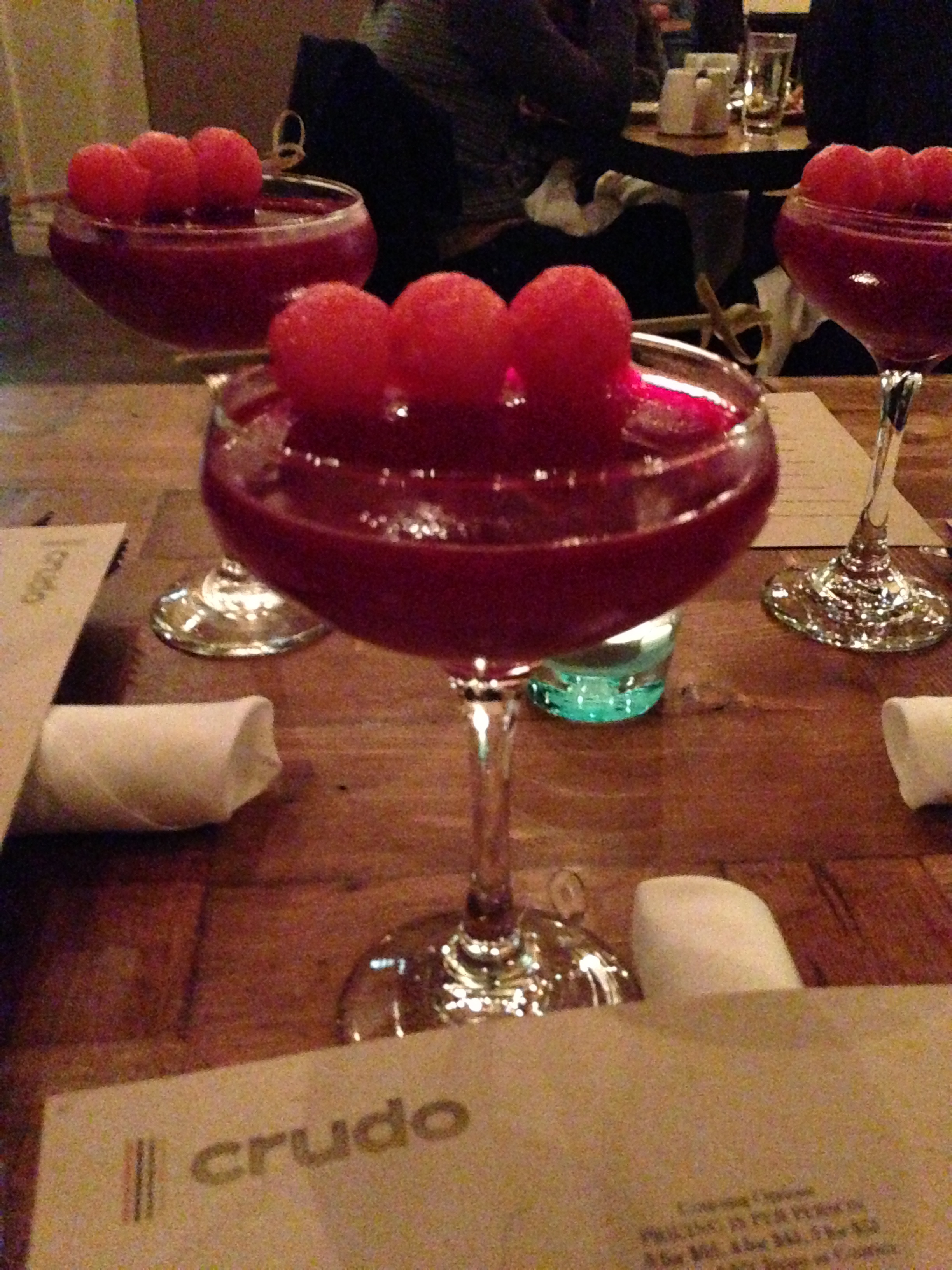 The rest of my party and the service staff had a trick up their sleeves to fool me, not an easy task to do (yours truly might be a bit of a control “freak”). Out came radiant violet-hued cocktails served up, garnished with familiar watermelon balls. Could this be? Really? If the Red Sox won the World Series in 2004 after being down to the Yankees 3-0 in the ALCS, anything could be possible…