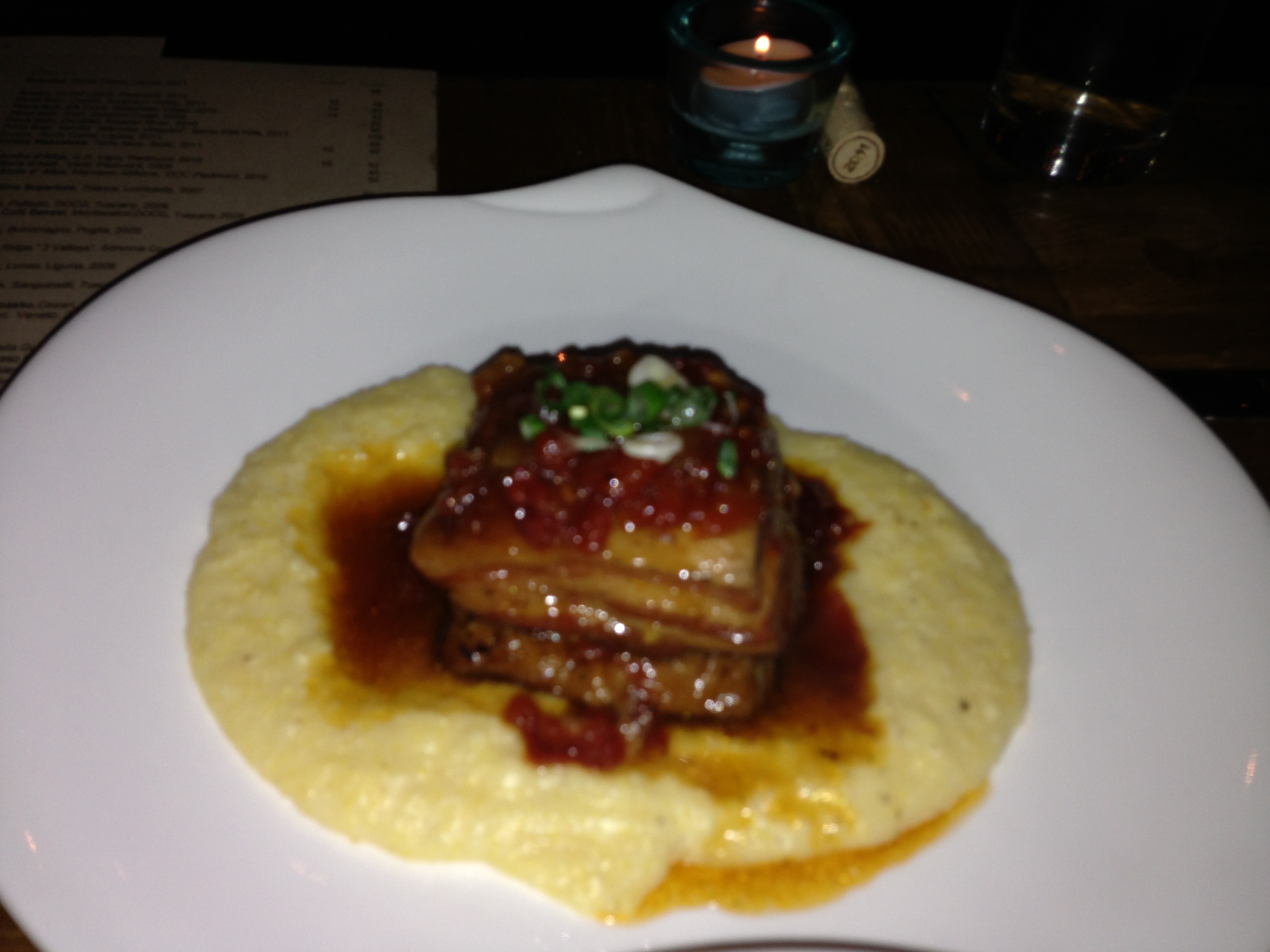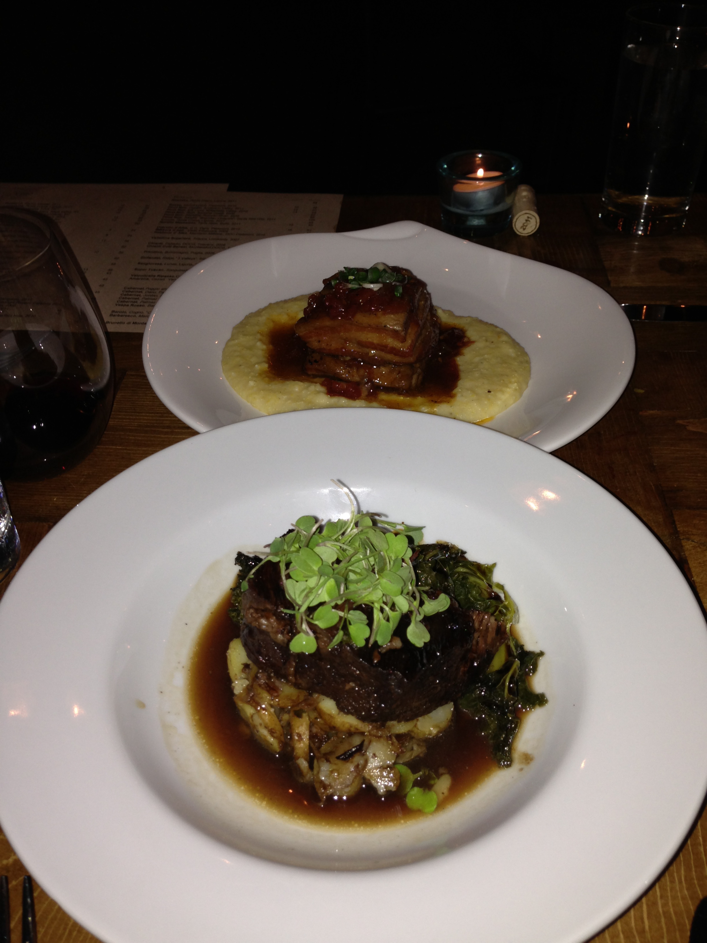 From the grilled section, that smoked pork belly square with a robust tomato agrodolce atop slick creamy polenta will win over any pork belly skeptics. The precise crisp skin to moist meat to fatty interior ratio is achieved; luxury with finesse. Tender short ribs are another winning wholesome choice resting above a cylinder of crushed fingerling potatoes, finished with a balsamic glaze and Tuscan kale.