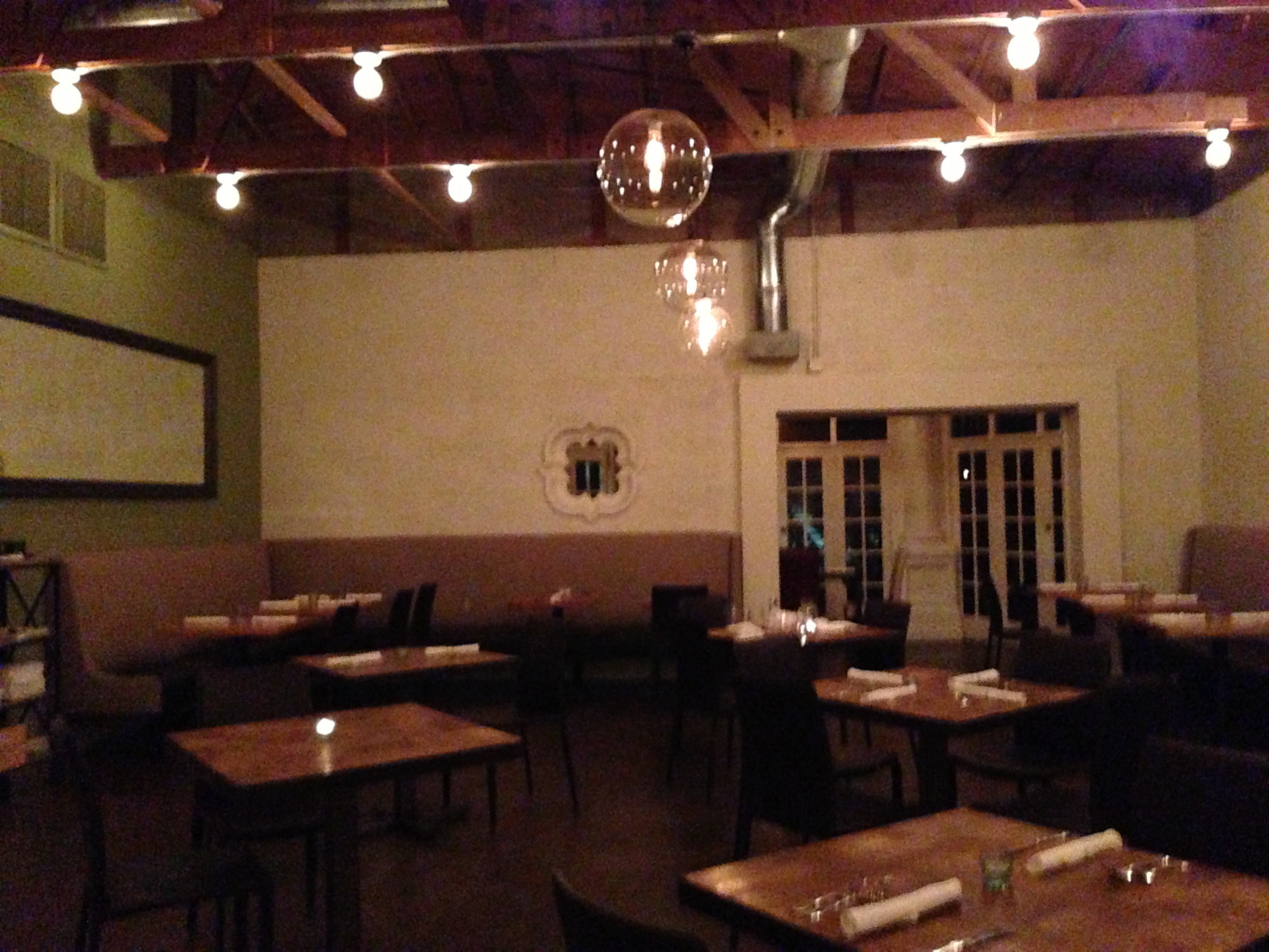 Despite the off-beat locale, the atmosphere is not an afterthought. The spacious, modern setting strikes the perfect balance between a rustic greenhouse and urban atelier. The contrast is colorful and striking. On one side of the room you encounter New England- evoking white shutters then look up and find industrial pipes leading to a wood-beamed ceiling. Despite the exposed white brick walls and the carry-over of conversation from the bar, noise is not an issue. Did you hear that? Yes. In theory Crudo holds 50 seats, but if it were run by sardine can- minded Manhattan restaurateurs, there would easily be 100 diners at any given time.