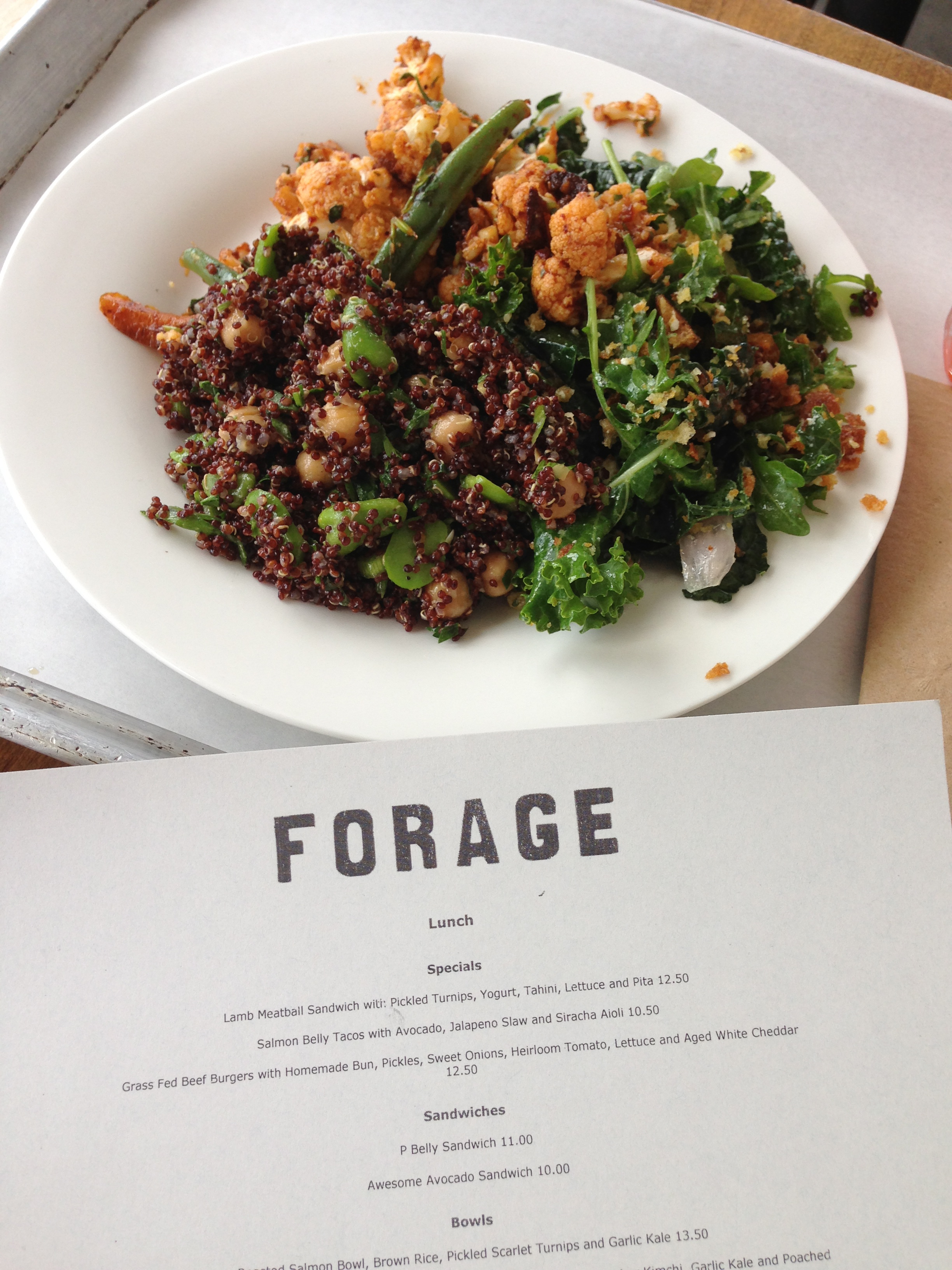 Forage, Los Angeles (Silver Lake): Red Quinoa with Chickpeas, Artichoke, and Fava Beans; Cavolo Nero and Arugula Salad with Feta and Breadcrumbs; Roasted Carrots and Cauliflower with Harissa