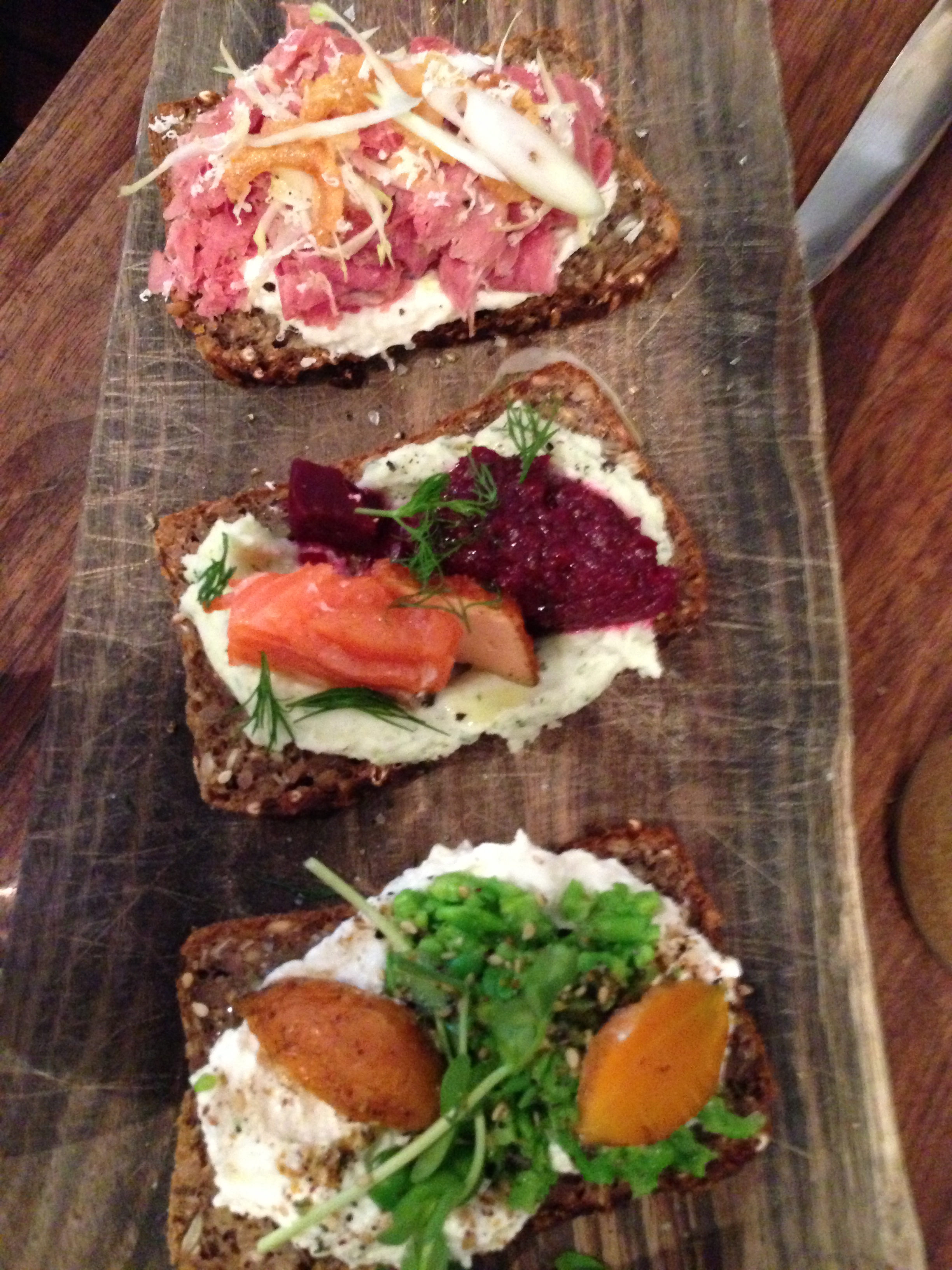 Bar Tartine, San Francisco: Smørrebrød (Open faced sprouted rye bread sandwiches) From Top: Corned Beef with Horseradish Sauce & Endive; Wild King Salmon with Beet, Potato and Dill Sauce; Quark Cheese with Peas, Curried Carrots, and Za’atar