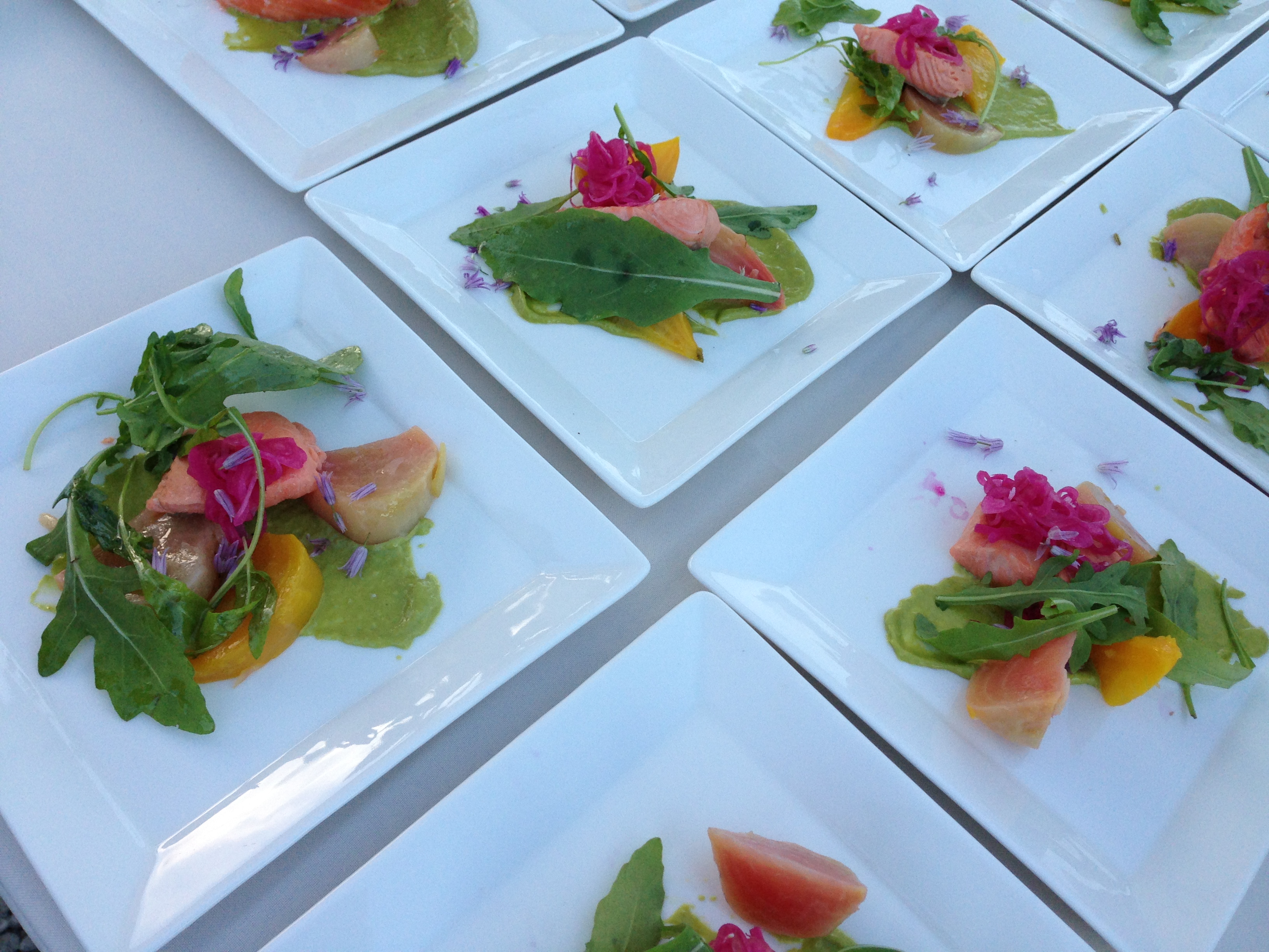- Big round of applause to Joy Road Catering, easily providing the premier meal of the weekend for that reception. Hard to pick the favorite: Oysters with rhubarb mignonette? Cold poached salmon in sorrel purée with various colors of beets and dandelion leaves? The “Noma-like” radishes in edible soil and goat cheese? Coming from California, I’d have to go with the toasted brioche points slathered with foie gras, garnished by a quince tuile.