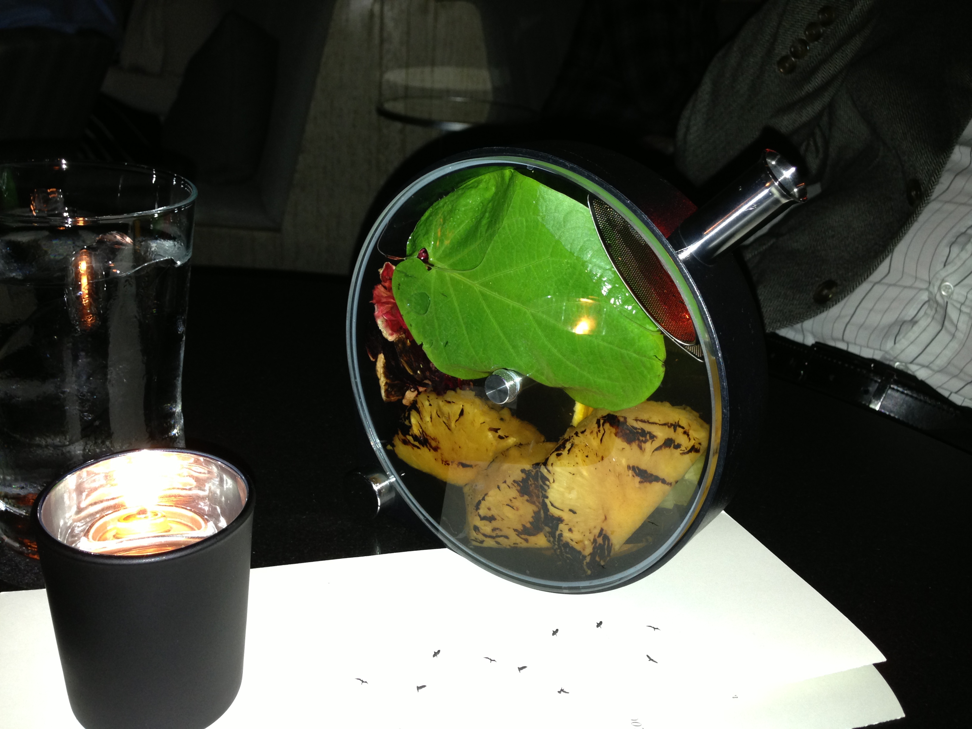 What to have at The Aviary? First, the elegant “The Avenue” with Calvados and Bourbon served in a flute, with a touch of grenadine and a smashing passion fruit sorbet gradually melting into everything. I adore both the “Tropic Thunder” in its slowly mixing “Porthole” contraption with mescal compressed pineapple, hibiscus, and bitter anhui lime, as the tequila infusion grows more and more voracious, along with “The Luau,” a carbonated soda bottle of pineapple, matcha green tea, Chartreuse, and Gin.