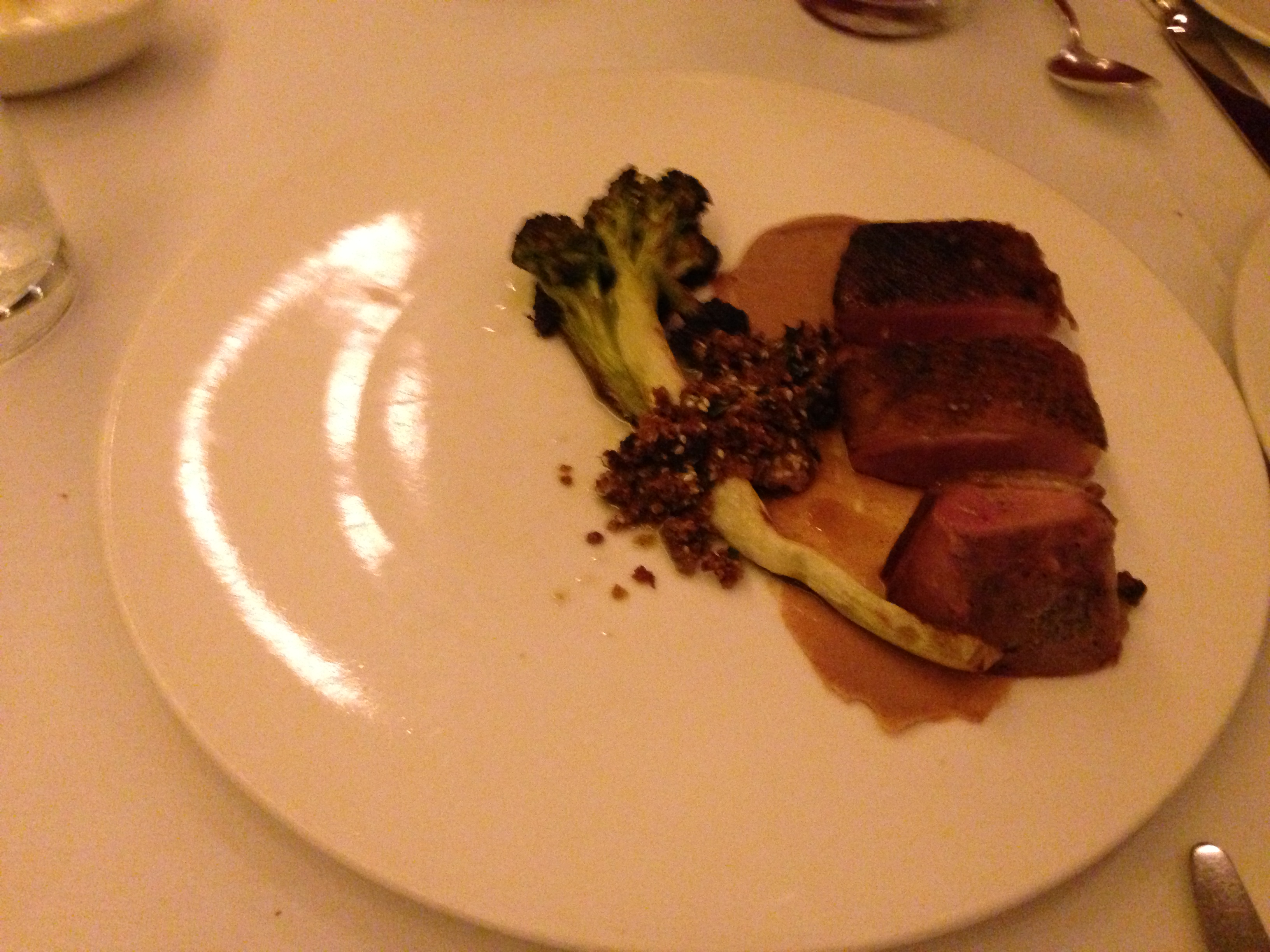 1. Aged Duck Breast with Broccoli, Potato Granola, Sesame, and Raisin Cream, Blackbird, Chicago
