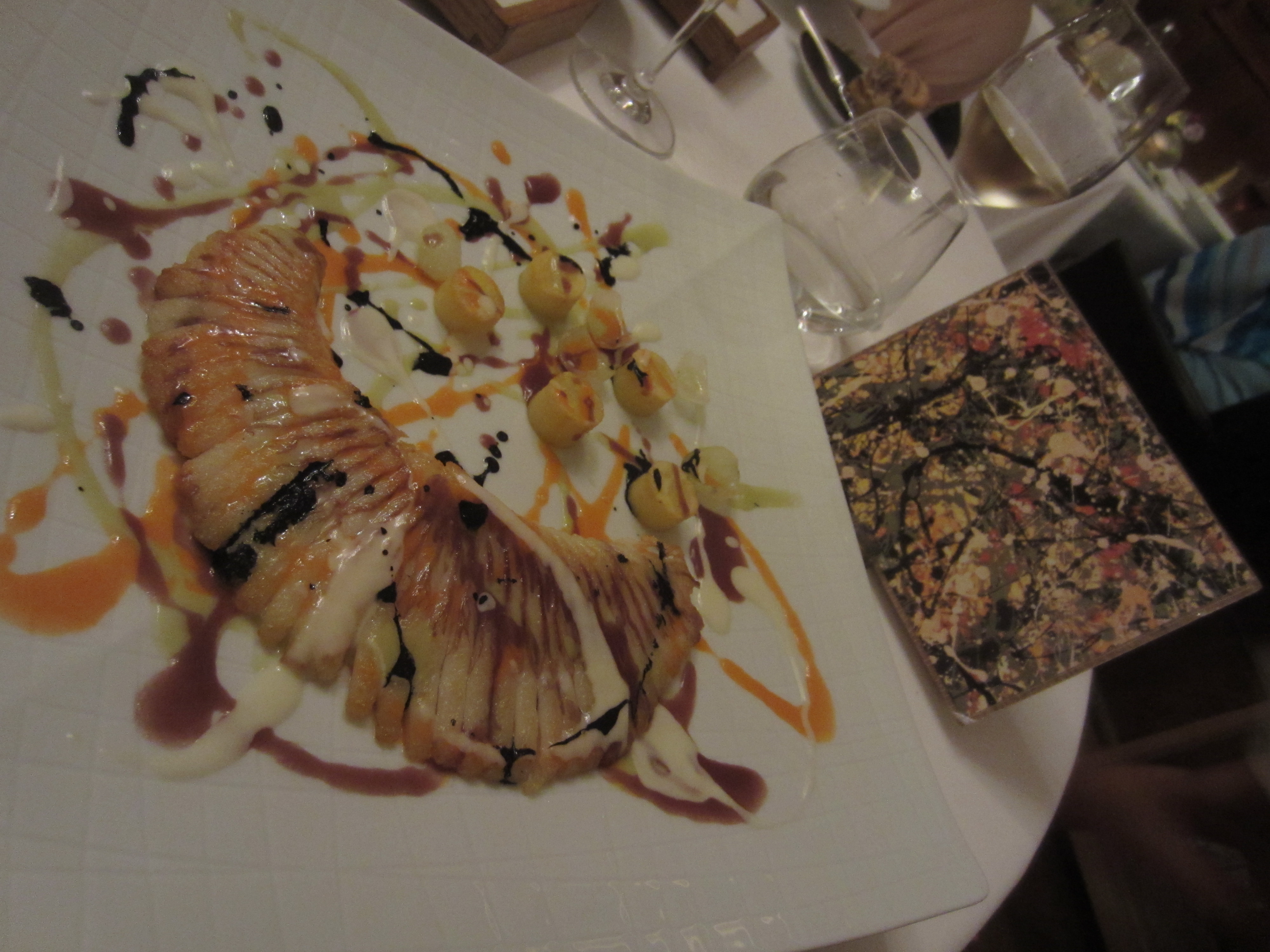 Meat-wise in Madrid, you think of the ubiquitous ham everywhere. Or the famed suckling pig at Botin, the city’s iconic restaurant, and the “oldest restaurant in the world.” You think of bull fights and hearty ox tail stews. But, goat kid? In the U.S., goat really shines most frequently in the Mexican consommé dish “birria,” with the soft meat tucked into warm corn tortillas. Here in Madrid is a case for goat as the ultimate meat. It boasts a gaminess tamer than lamb, with all the crisp, fat, and saltiness of an exemplary suckling pig. Pardon my scientific background, but imagine if we engineered the combination of suckling pig, lamb, and pork belly. Talk about the ultimate invention for carnivores. Well, we’re talking about goat kid. Freixa’s goat kid comes as a mini log rolled with Majorcan sausage and honey that tastes strongly of a sweet Kansas City barbeque sauce. A small potato and licorice spiral tartlet, two pea pods, and an elderflower jelly add superb contrast to the kid. Ignore the banal pasta and spicy sausage “minestrone” that is another component of the course. The focus is on this goat kid. A true masterpiece for its gentle texture, its robust character, and sheer glutinous joy.